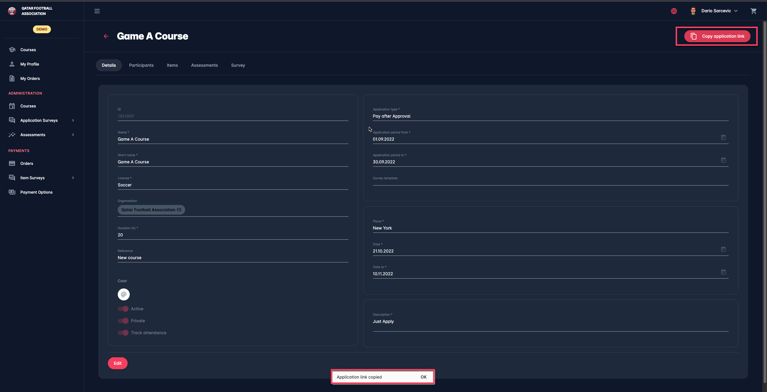 Use the Copy Application Link button at the top right corner of the screen to invite the applicant to the private event