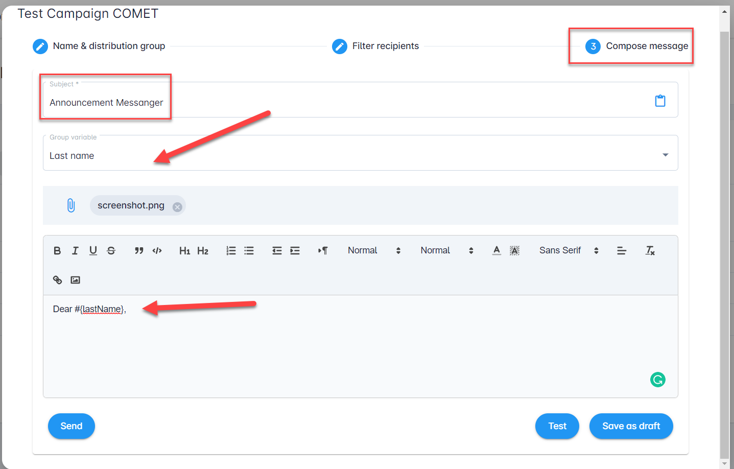 For example, the variables from the message template in the example above will be replaced with the data of each individual recipient from the distribution group list: