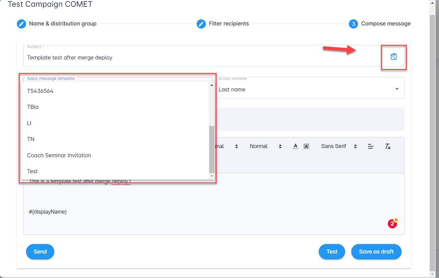 There is an icon Show message templates on the right side of the Subject field. If you want to (re)use your message template instead of starting a message from scratch please click on this icon. This will extend the field for message template insertion > Select message template from the drop-down list.