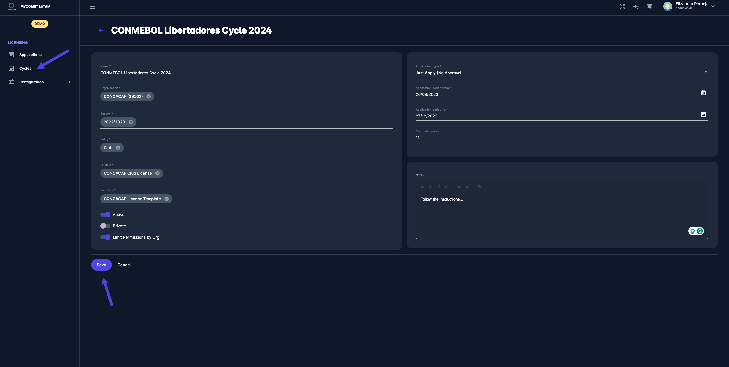 Limit Permissions by Org → Please consider that if this switch is enabled, the permissions within the Cycle will be set so that Licensing Managers/Experts can conduct actions and transactions only for Clubs underneath their organization.