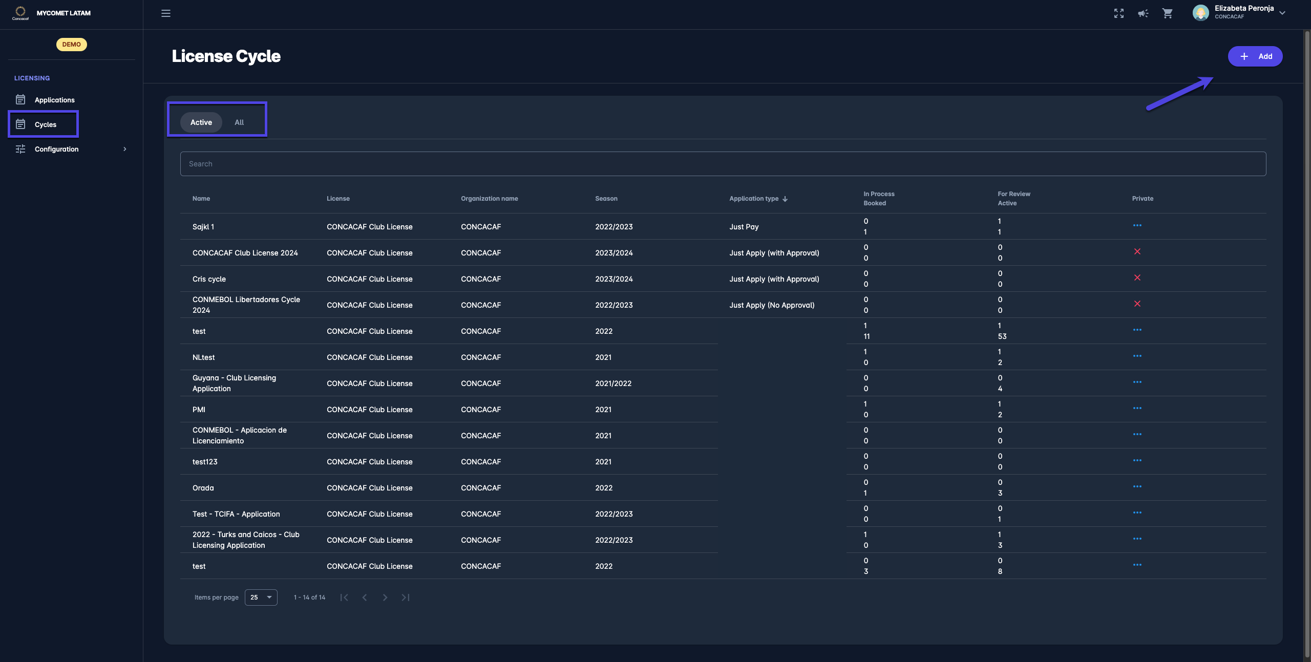 The list of all License Cycles can be filtered as Active/All (note that only active cycles can be used for applications; inactive cycles are just displayed on the All tab), by Organization, and by Modes of applying