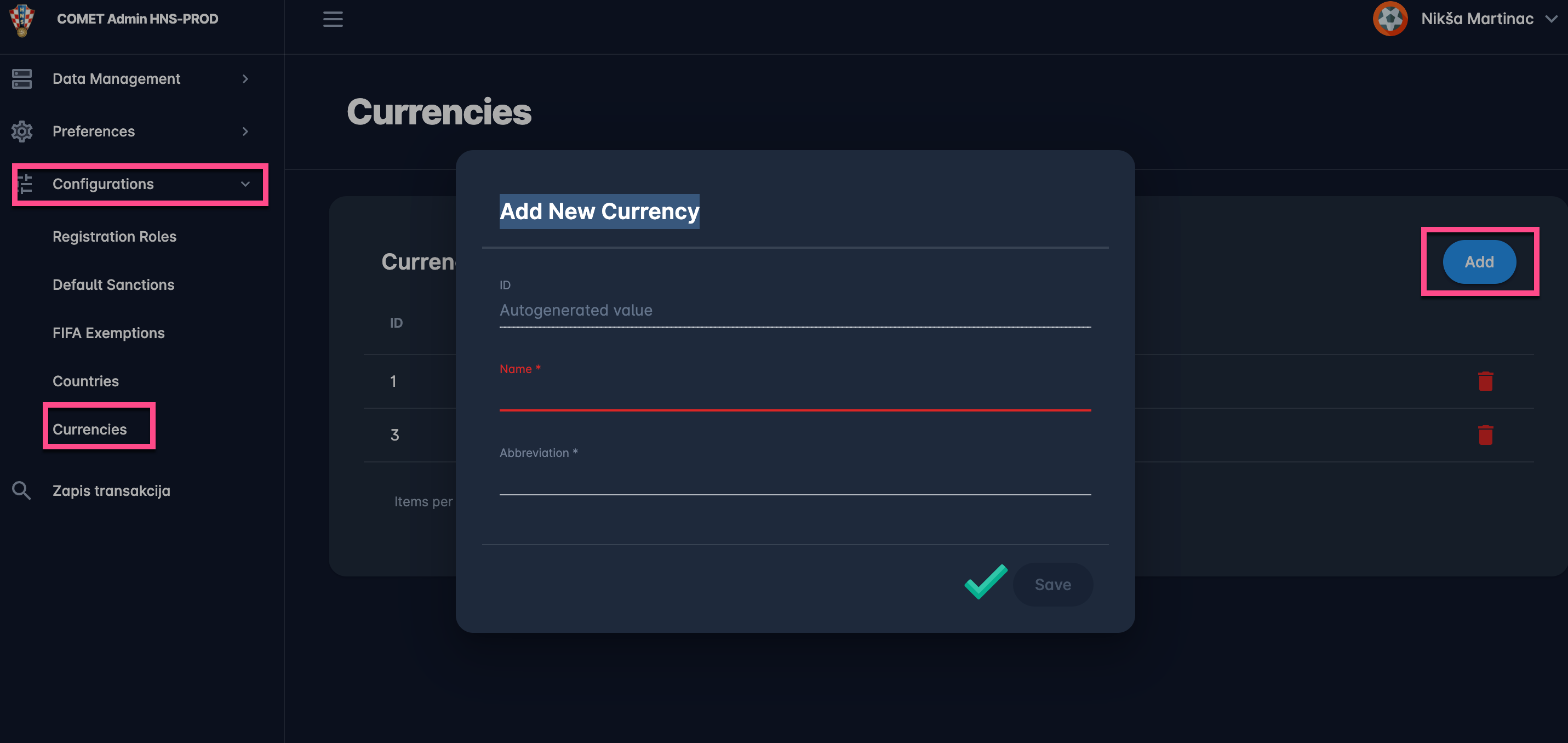 💡 Please take into account that name and abbreviation are mandatory fields and they should be unique, i.e. the system will not allow saving a currency: