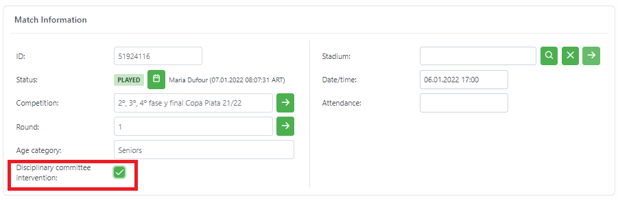 Match screen contains checkbox "Disciplinary committee intervention".