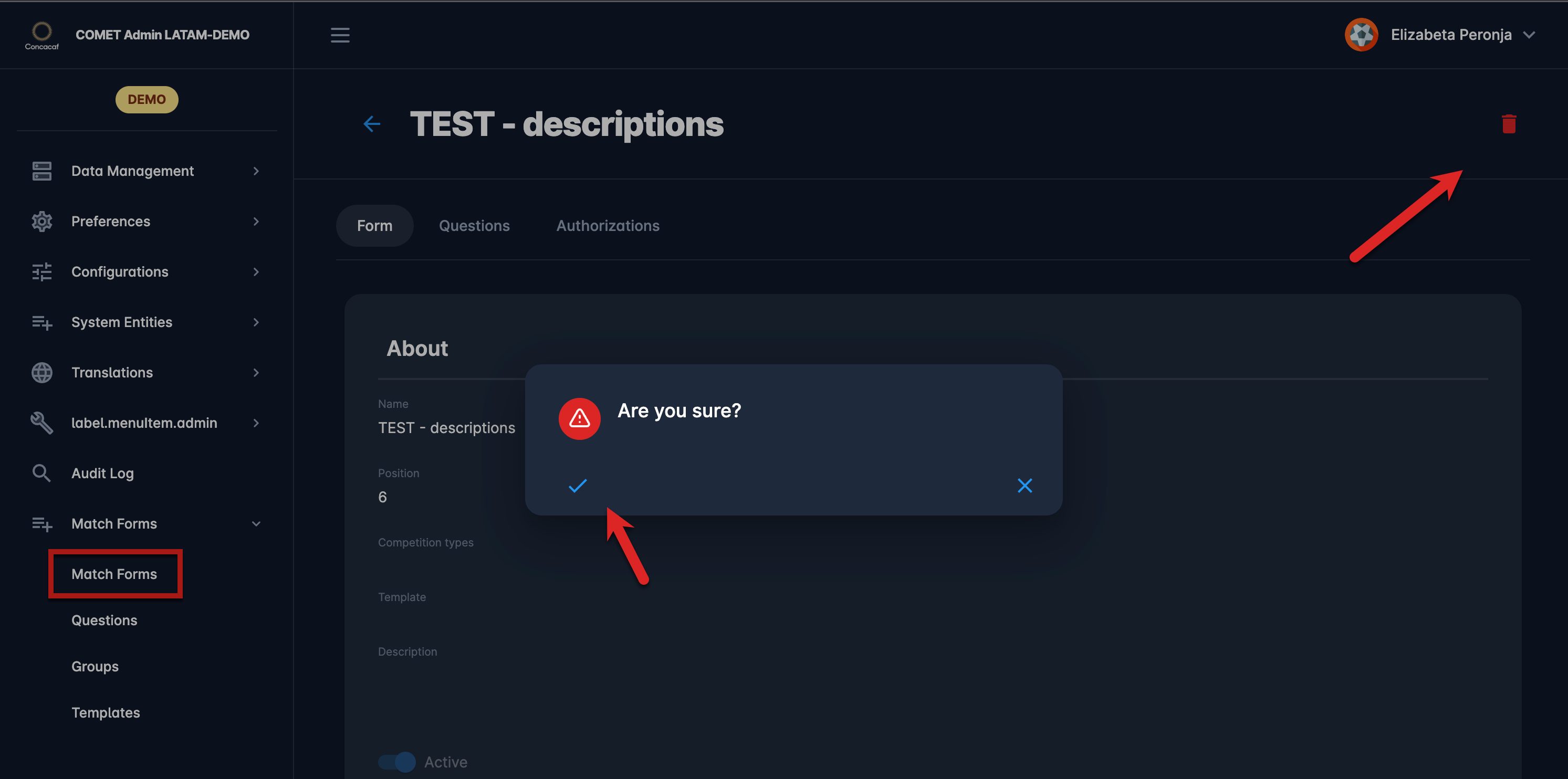 Take into account that any modification of the existing match form will be applied only to match forms of the future matches (that are not yet generated in the COMET System), i.e. the filled match forms will remain as they are. This way the historical data will be preserved in the COMET System.