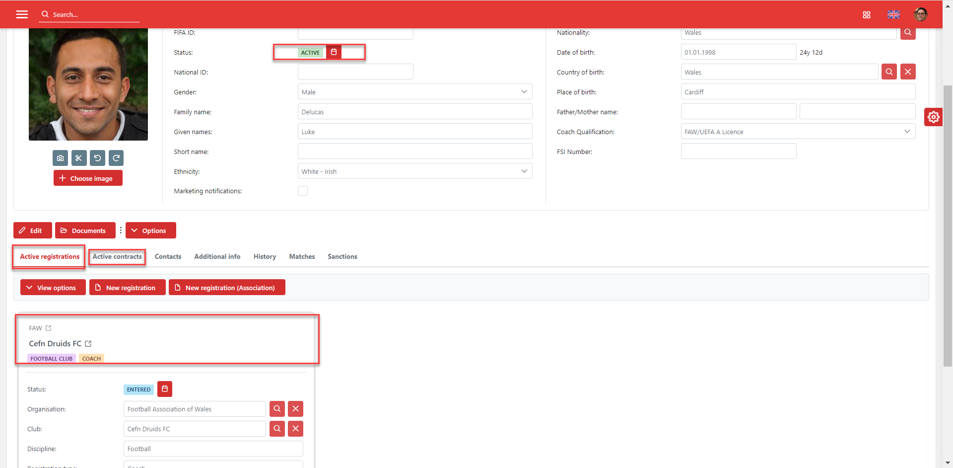 A coach may also have an active contract, but this is not required. However, if a coach has an active contract, they are also required to have an active registration.