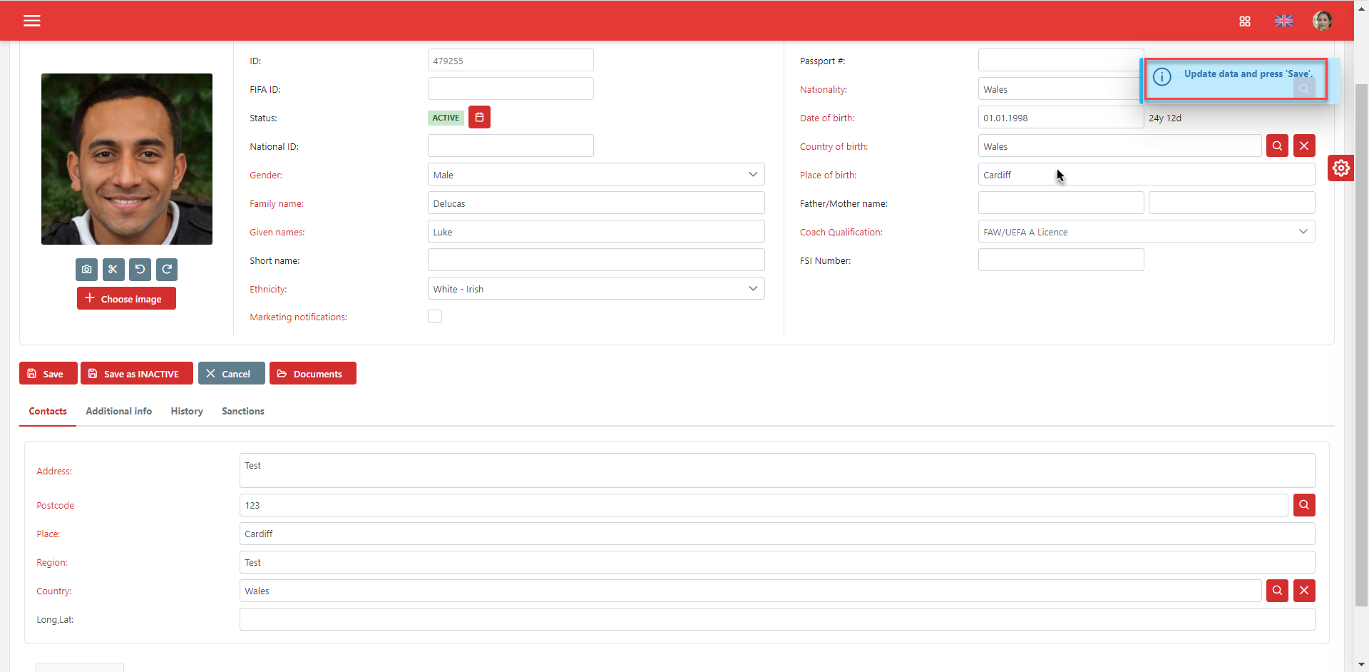 By clicking the Edit button, the form fields become editable, allowing you to change or add information about the selected coach.
