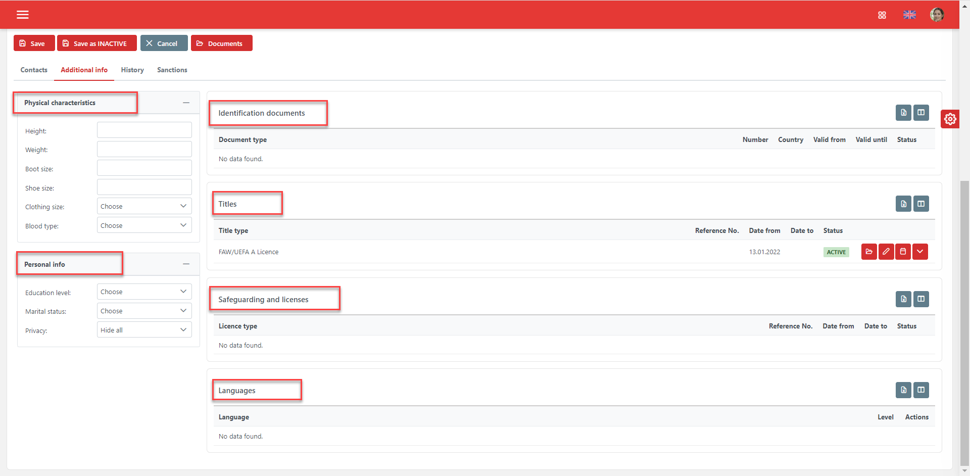 The Additional Info tab keeps the following data about the coach: