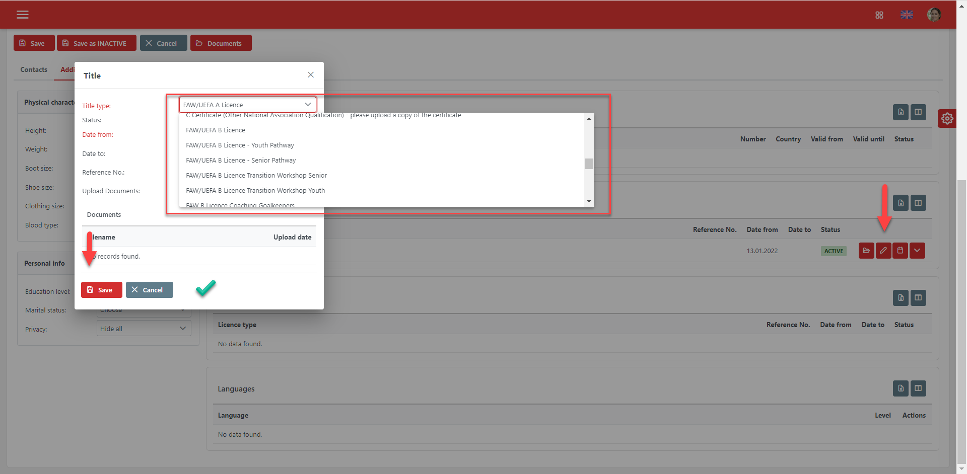 The first tab displays only the active coaching registration for a specific football club