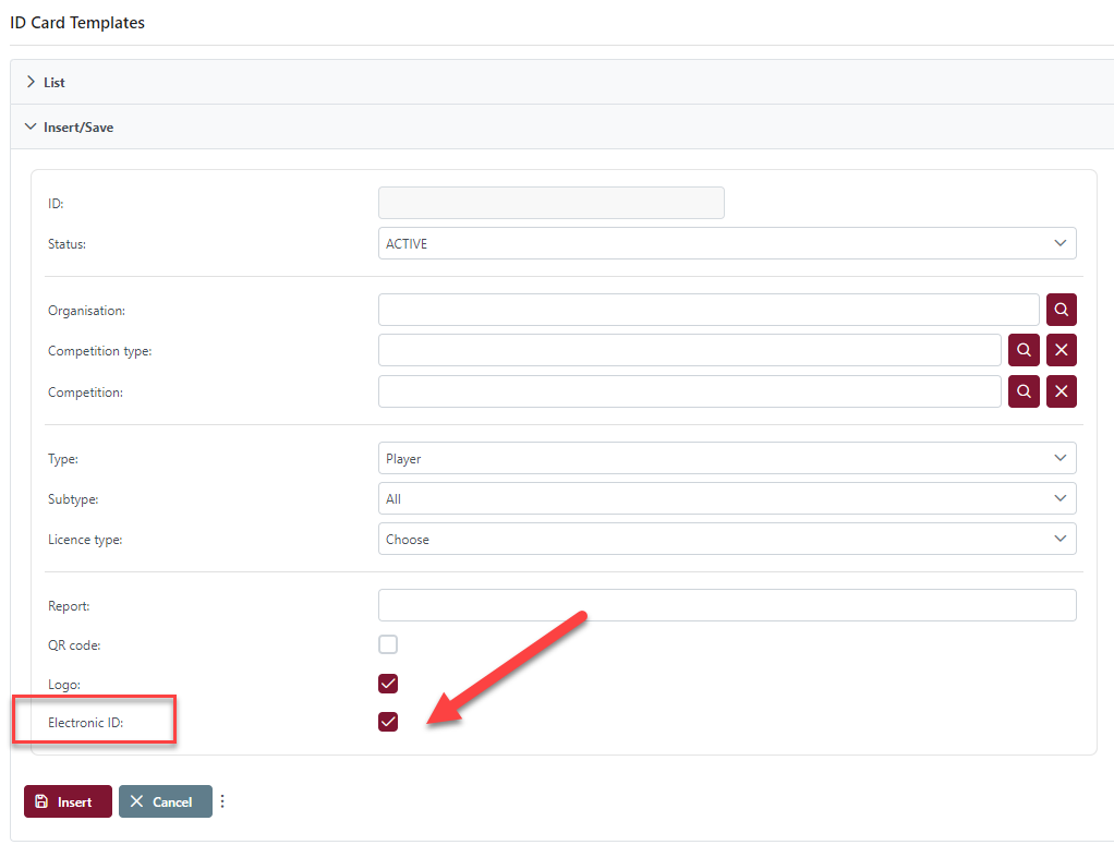 ID card template form includes the field Electronic ID. This is a Boolean field which tells COMET if the printed card is a regular ID card or an electronic IF card.
