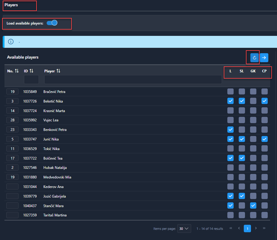 By clicking the "Refresh" button, the system automatically fills in the "L", "SL", "GK" and "CP" fields according to the data inserted for the previous match.