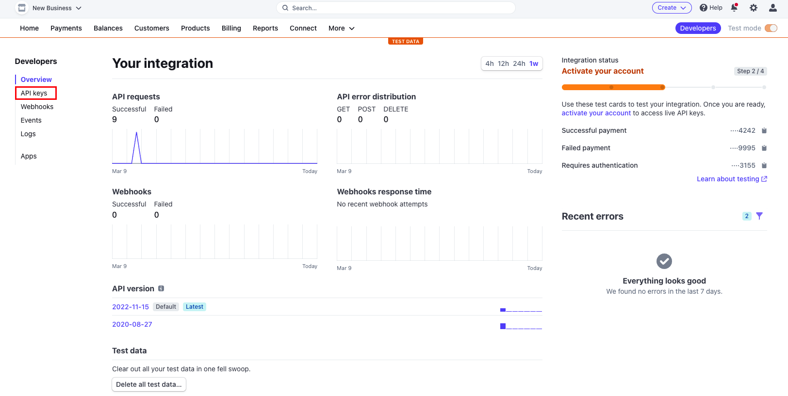 To access the Publishable Key and the Secret Key, select the API keys submenu on the left nav bar.
