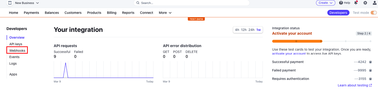 Once you have pasted the Publishable Key and the Secret Key, select the Webhooks submenu on the left nav bar (highlighted in the figure below)