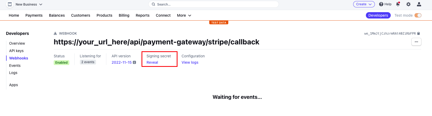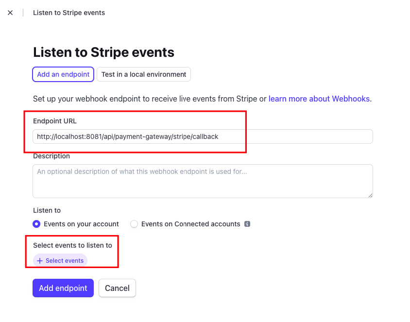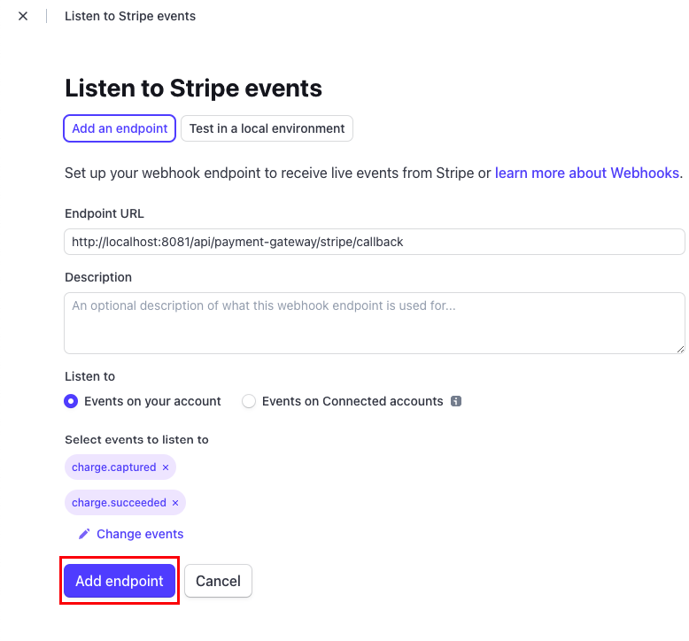 Paste the URL value in the Stripe Endpoint URL