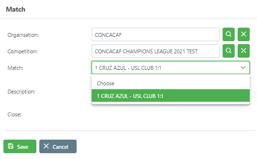 After adding matches, they appear on the list, and the number of remaining matches is set to 0. If you need to insert a match not in the COMET system, you can insert a description into the description box instead of selecting a match from the drop-down list.