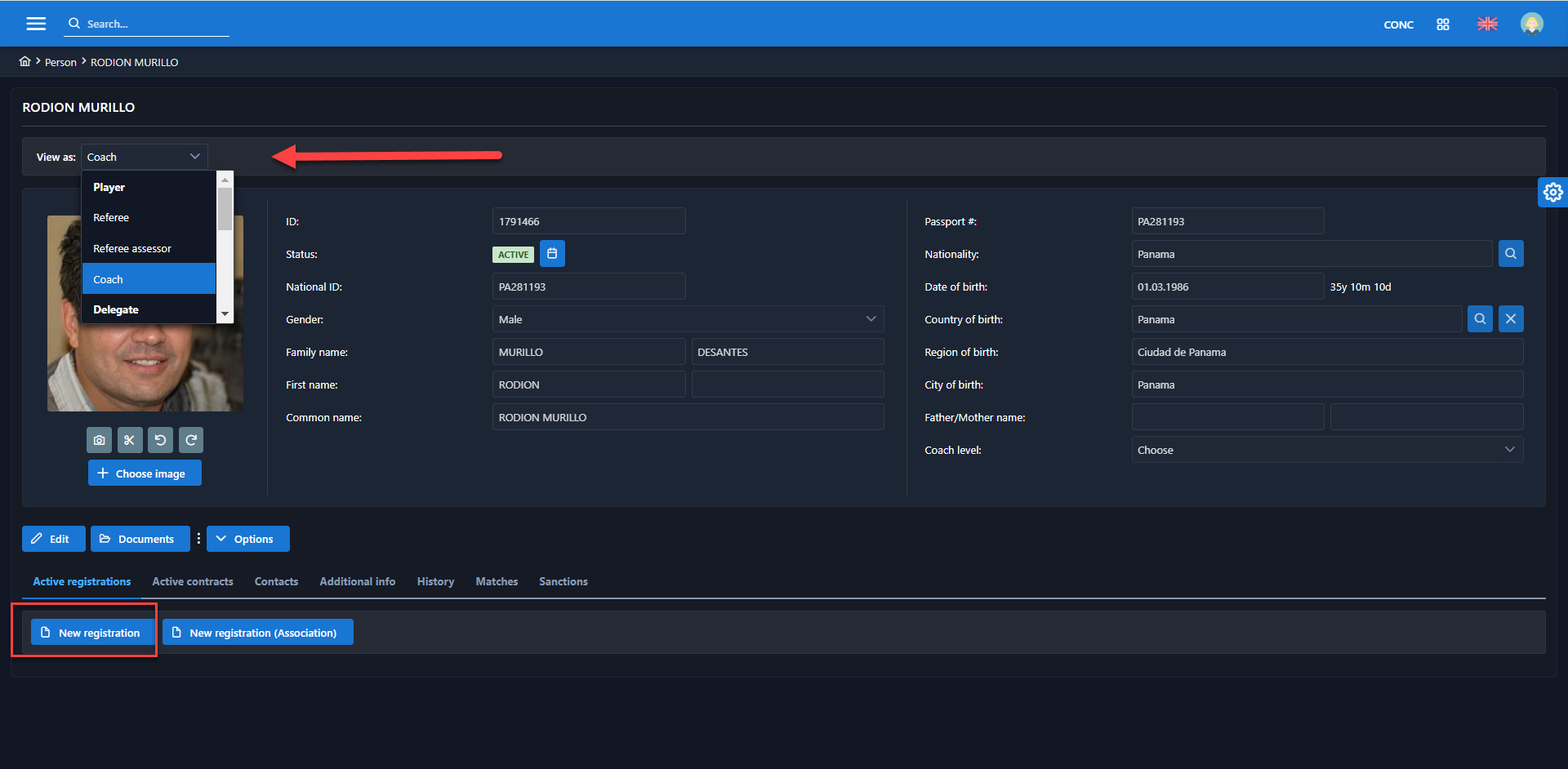 Select the desired module from the main menu and then the menu item for entering new registration, e.g., "New coach", "New referee", "New observer", etc.