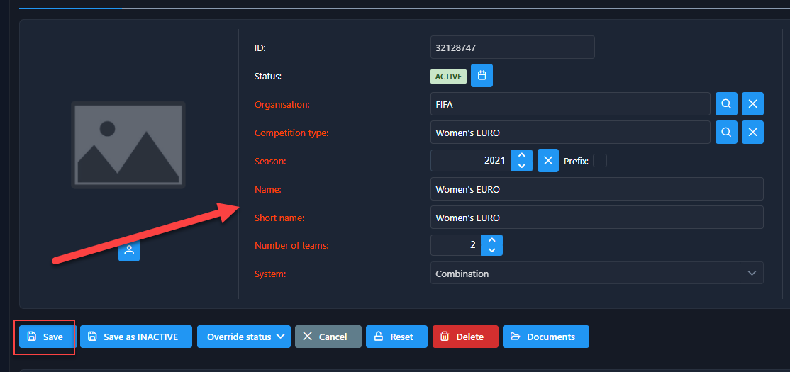 Enter all the mandatory data (organization, competition type, season, name, short name, number of clubs and competition system)