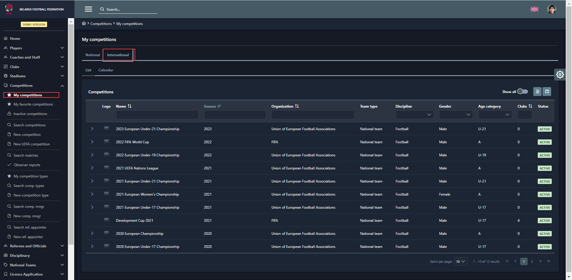 The international competition and matches are created in the same way as the national ones. To create a new competition: