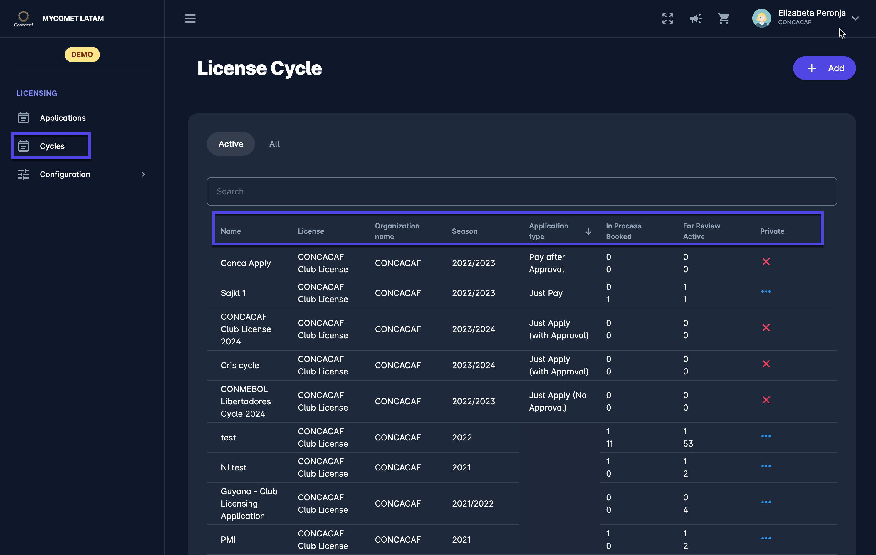 Please consider that on the cycle list, you can see the number of clubs whose application for the licensing is confirmed, i.e., they have booked their place. The “Booked” column displays the number of clubs that have confirmed their place for licensing. According to the application type of the licensing cycle, their status implies that they have been accepted for the licensing, i.e., they are counted in the Max participant fields (e.g., their status is Approved, Confirmed, Pass, Fail).
