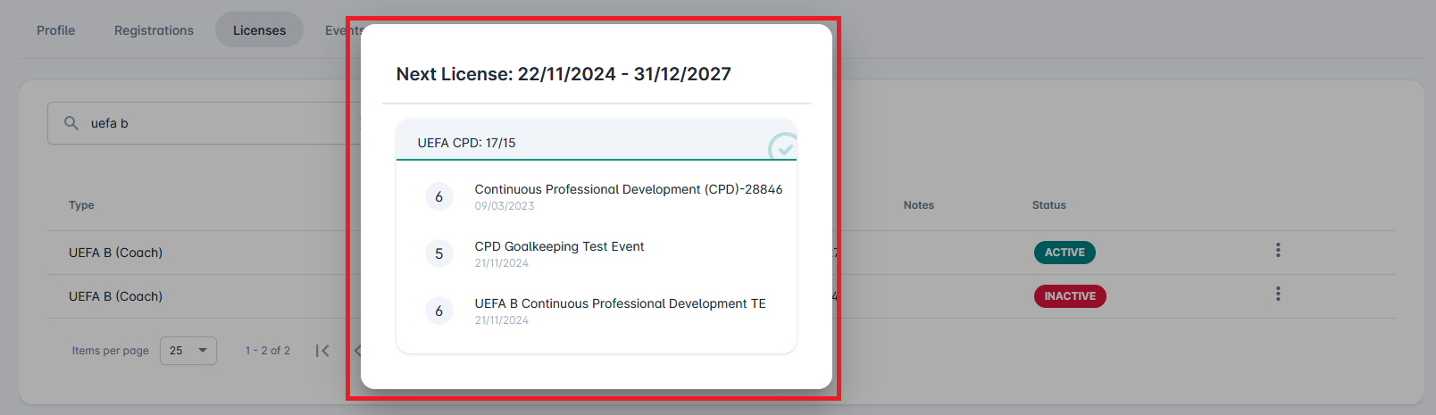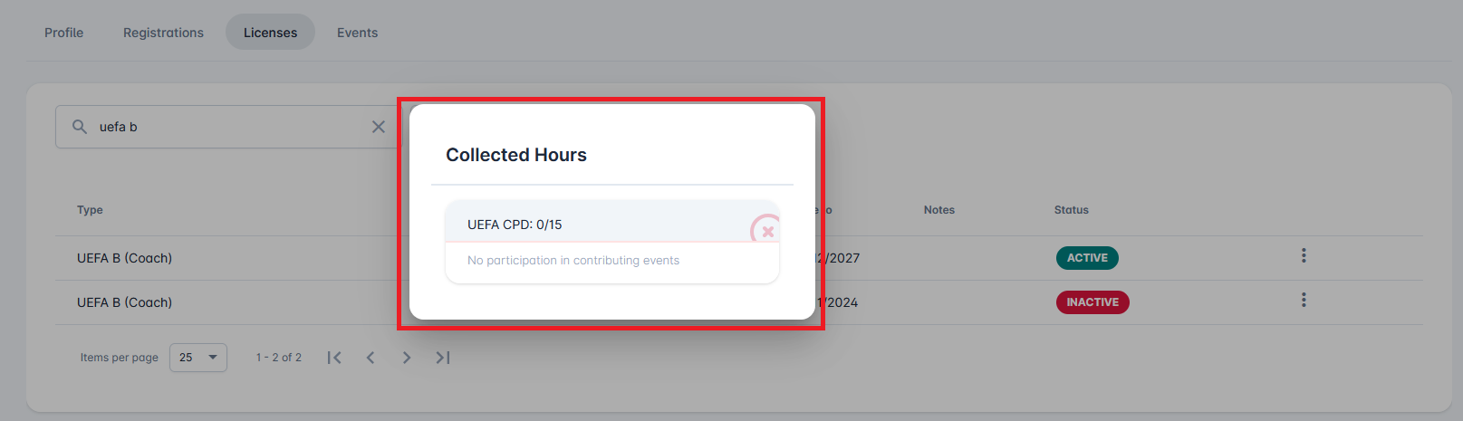 In order to have the license extended, the holder of the License must complete the required number of hours for all Extension Plans configured for that specific License Type. In the example above, that coach will only have their license extended if he collected at least 5 hours for UEFA CPD GK Specialisation (which he already did), and 15 hours for UEFA CPD (which he did not complete yet).