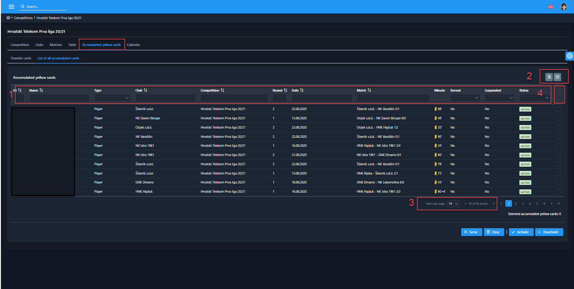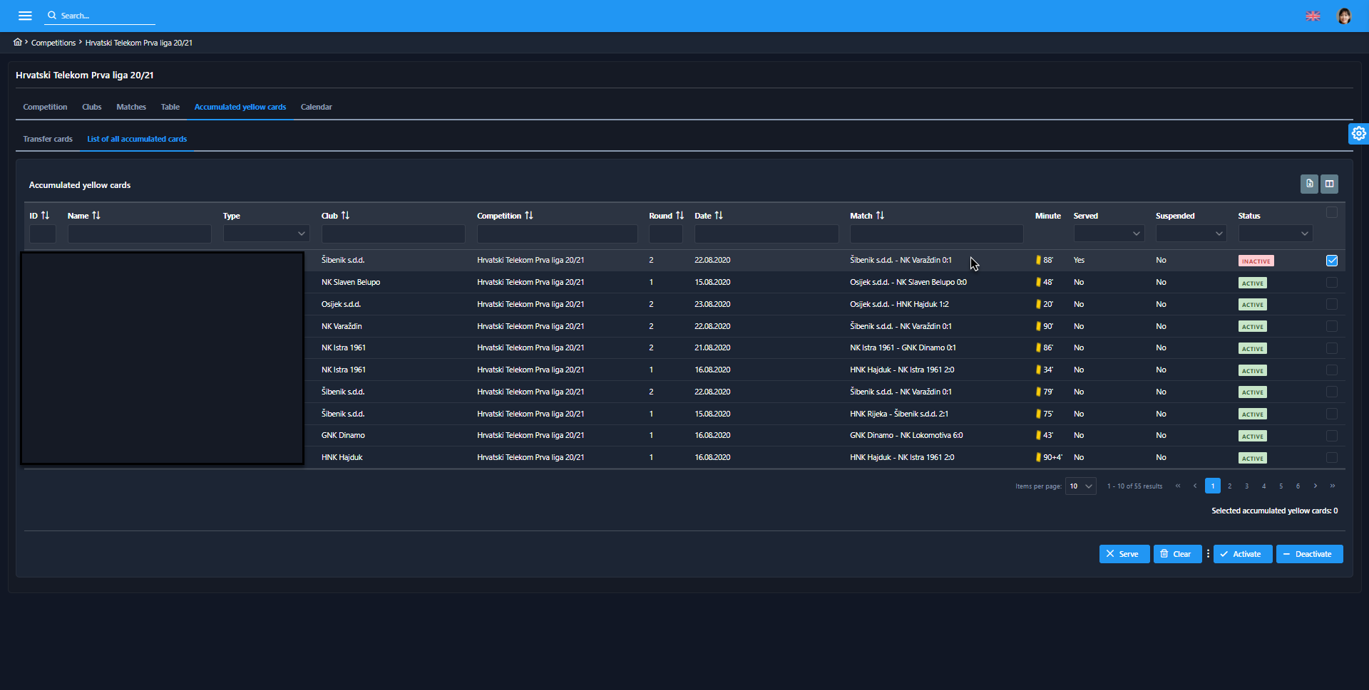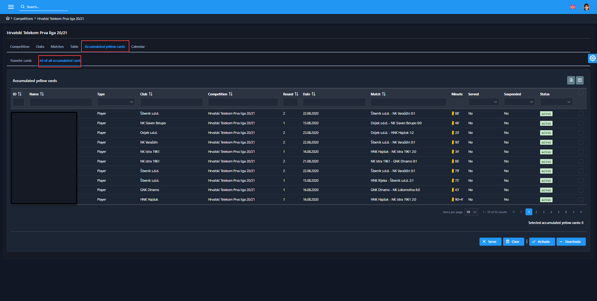 The new console for Yellow card management contains all relevant information about every accumulated yellow card given in current or relevant competitions, including: