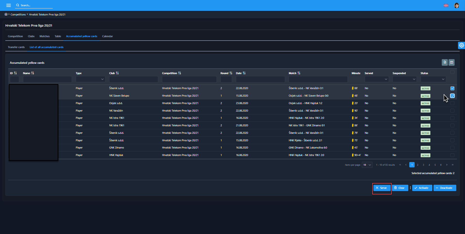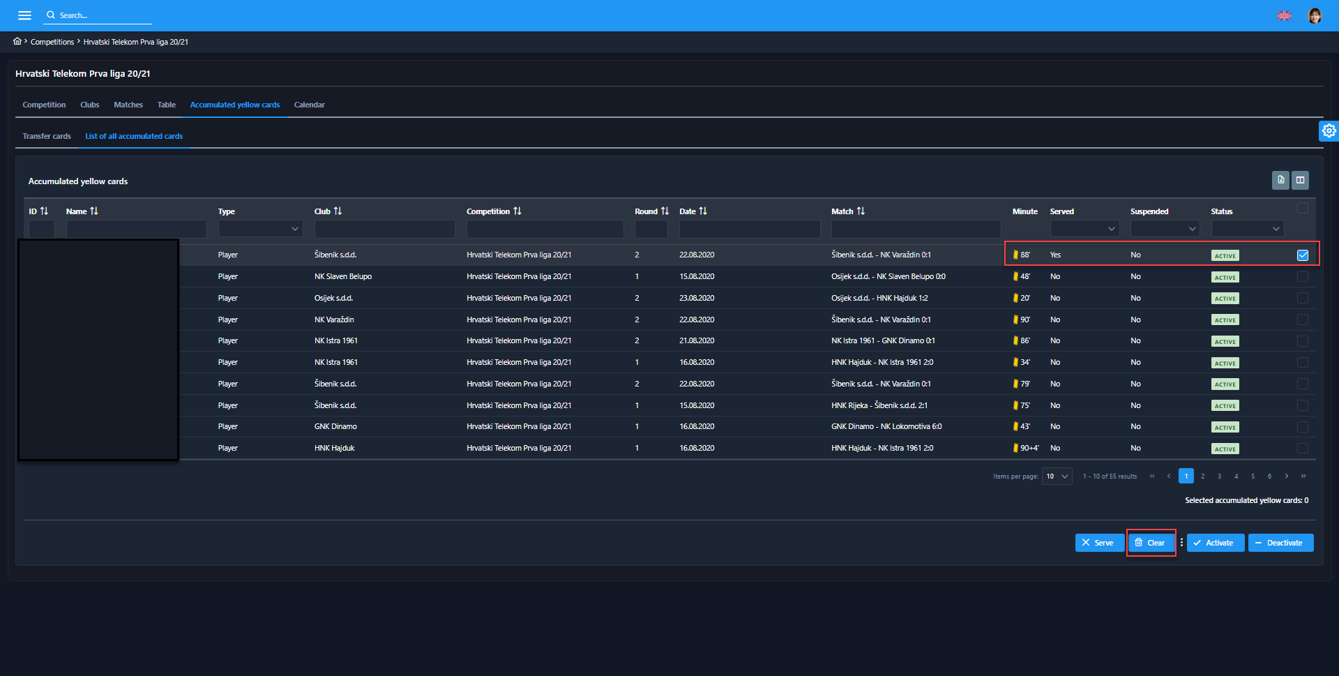 Users can mark the selected yellow cards as ‘'not served,’' i.e., clear the ‘'served’' status if needed. The ‘'clear option’' will make YC relevant for accumulated yellow card calculations.