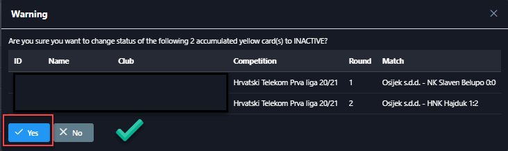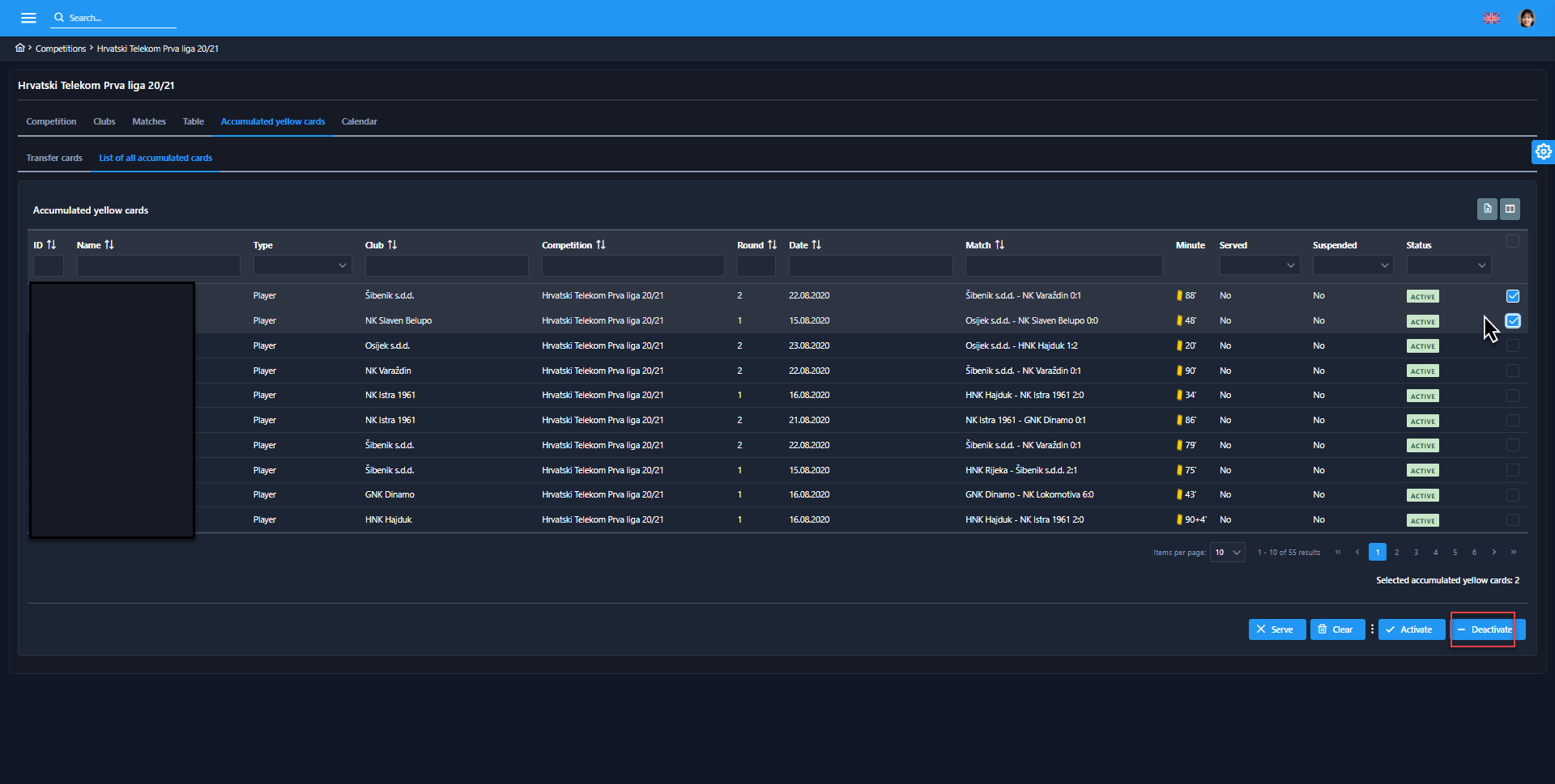 If a specific club has left the competition and the user needs to deactivate all yellow cards of that specific club, this new functionality enables you to deactivate it within one action.