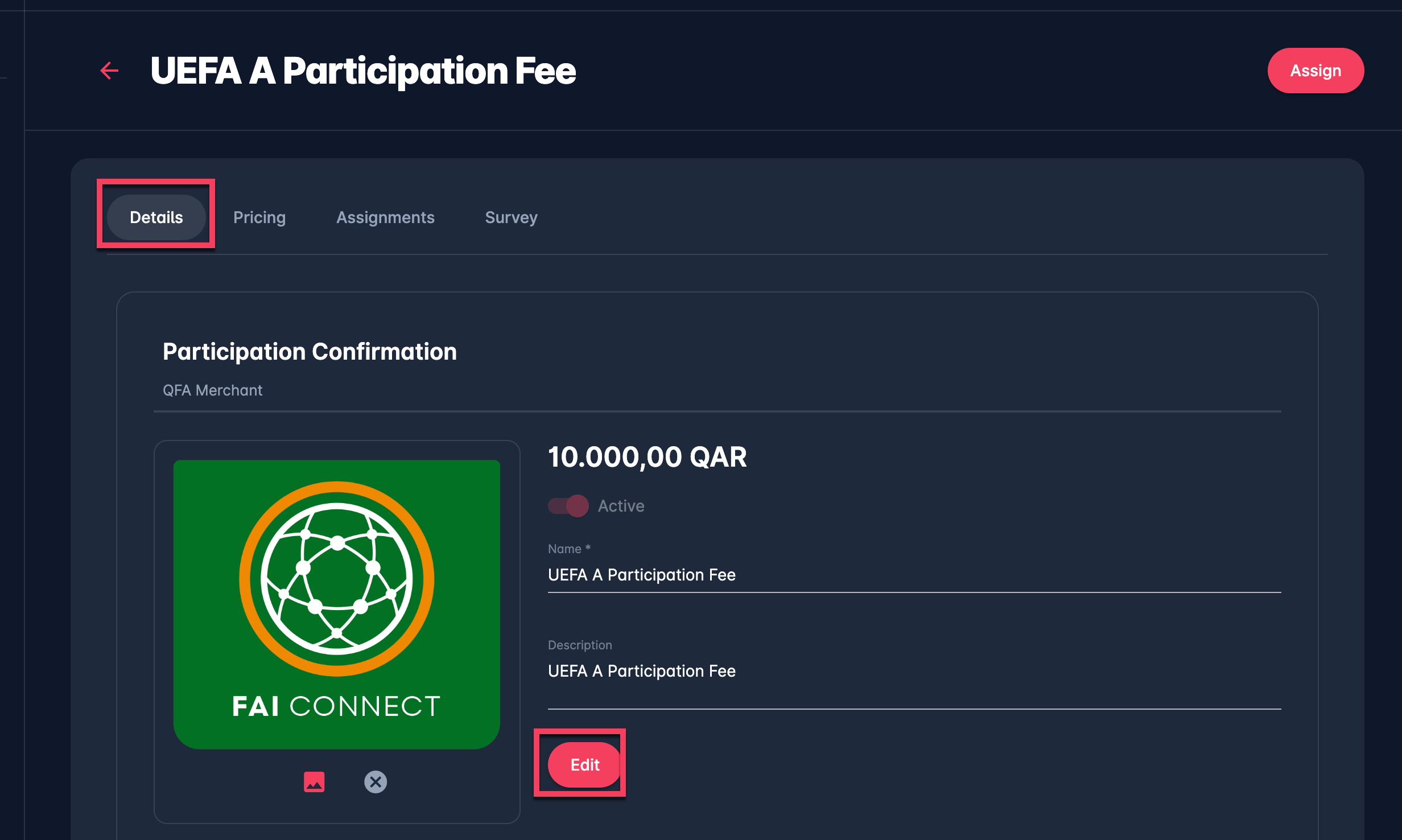 On the Assignments tab, you can review the payment status, edit the assigned price, and create new assignments for the event items. You can use this feature to assign an Item, with or without price, to a specific User.