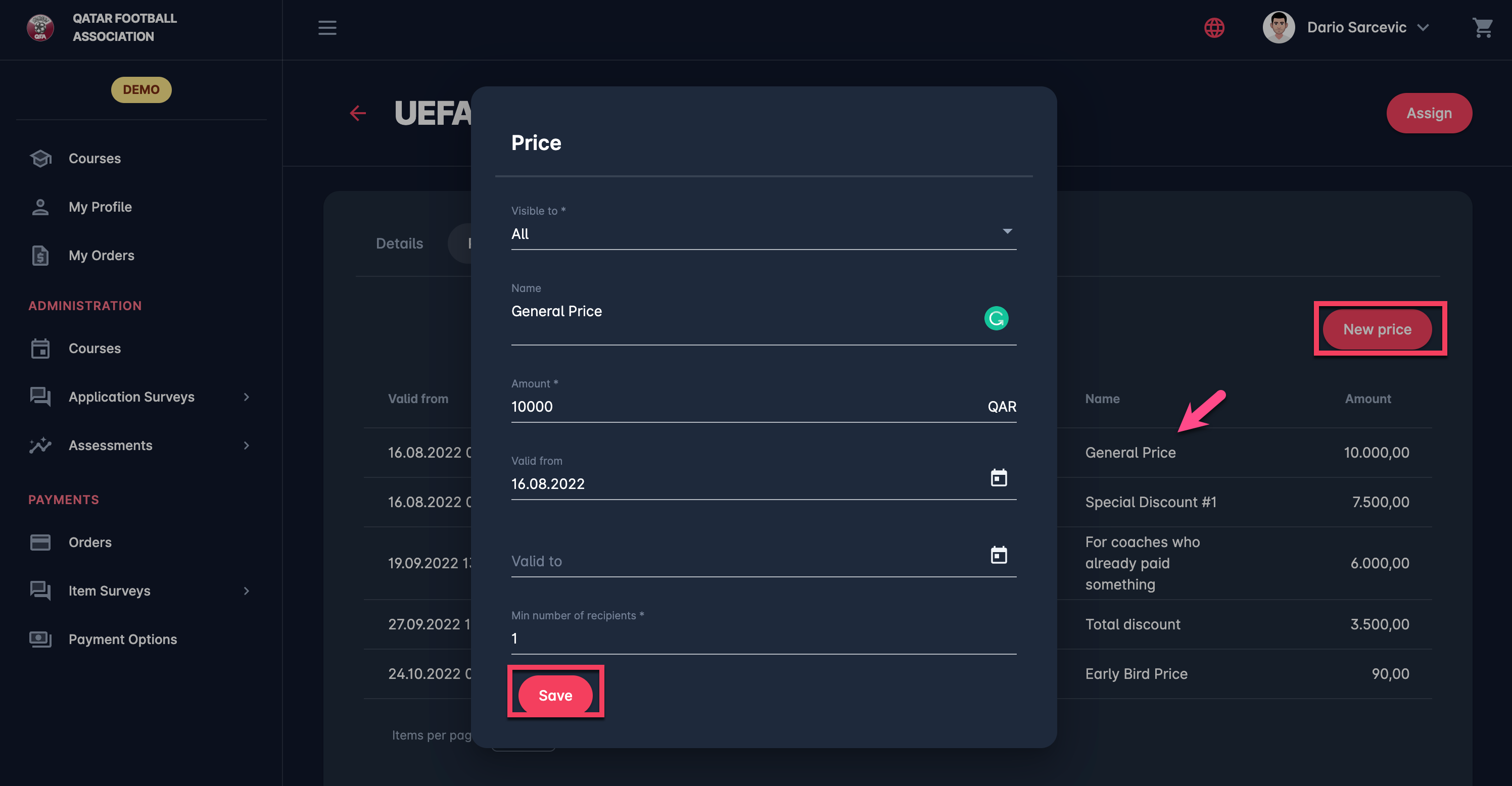 On the Pricing tab, you can update/edit the amount of the existing price and create new prices for the event. This feature of adding additional prices to items can be used for different scenarios, such as special prices for specific users, prices that are valid for a certain period, special discounts, etc.