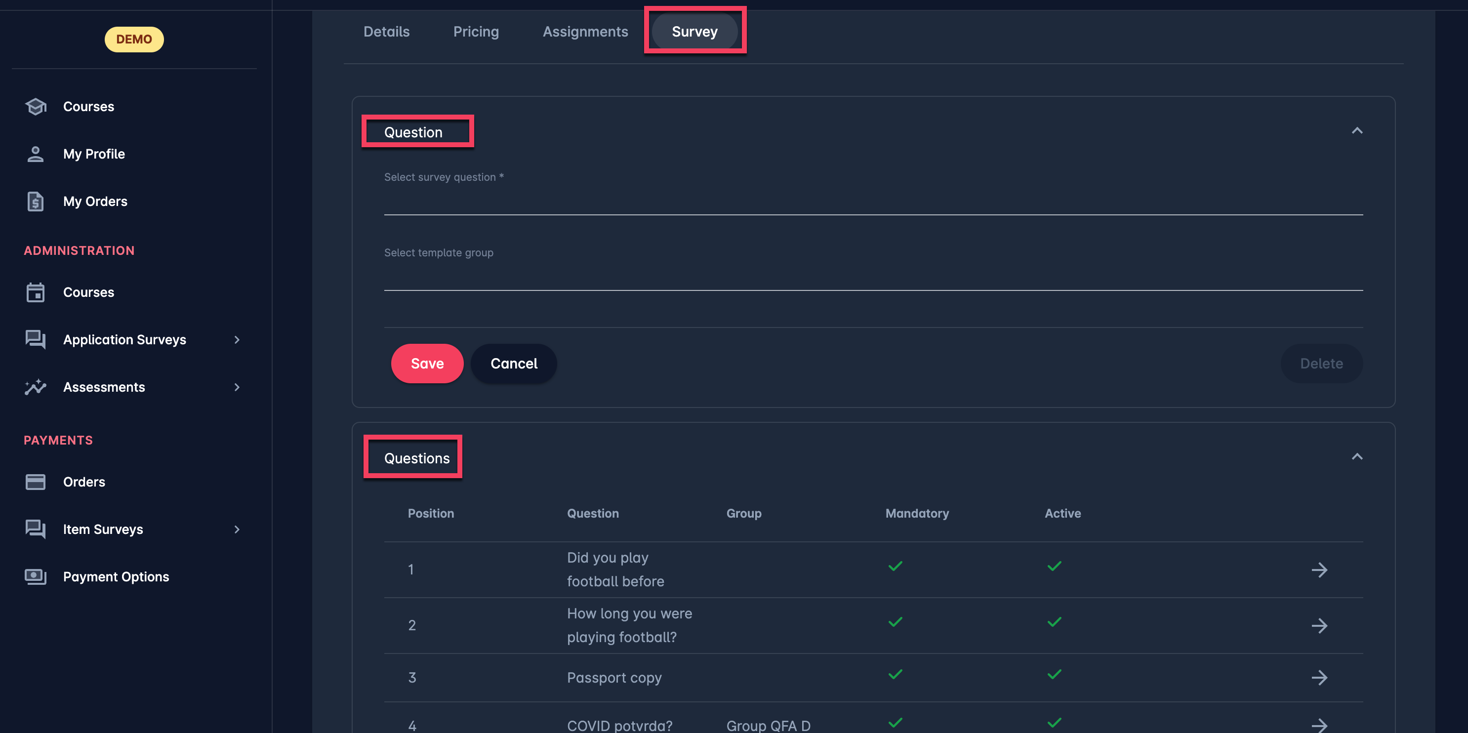 On the Survey tab, you can review the Item survey questions or add a new survey question. This feature is used if there is a need for applicants to fill in the specific survey form (i.e., answer the questions/provide specific info) before purchasing an item.