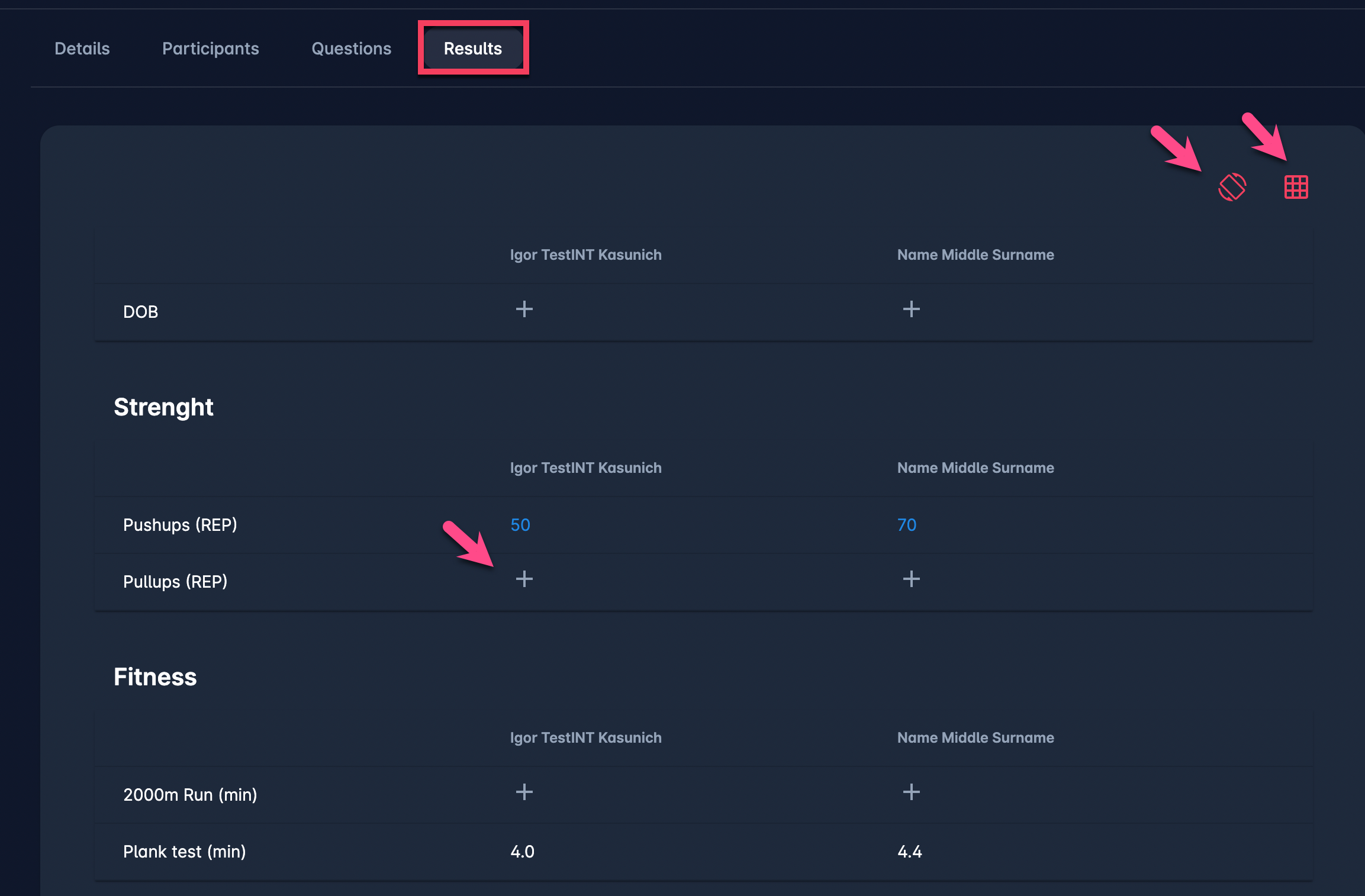 On the Results tab, you can record and track the assessment results for the event participants. Predefined Unit Values are to be entered in the results table. The results table is a matrix consisting of the participant name and the assessment question.