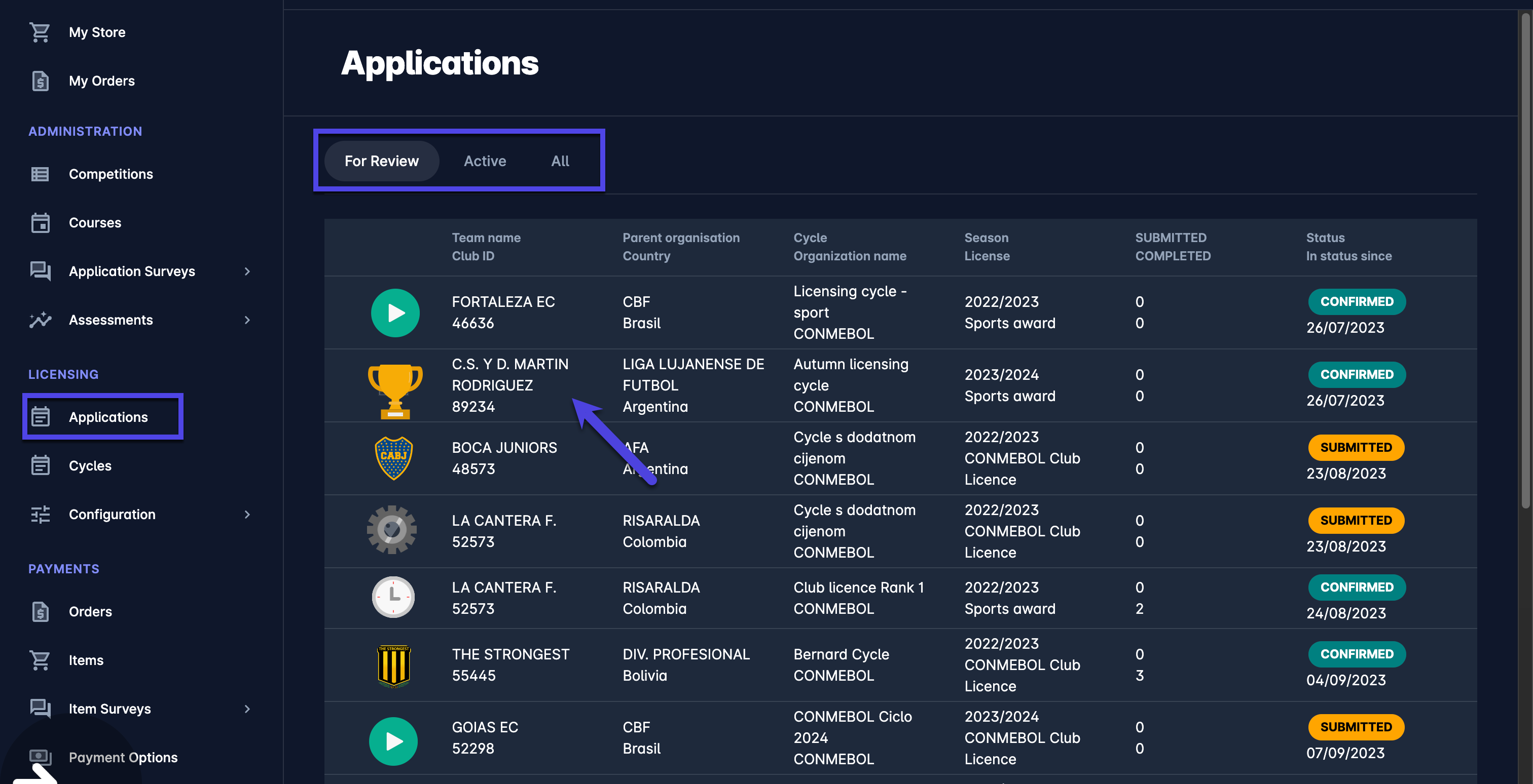 Active (displaying active applications for active Club License Cycles)