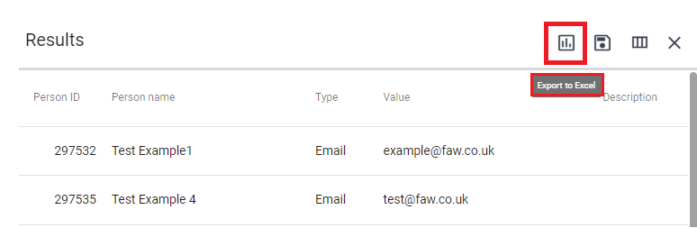 For additional analysis and processing of the presented data results, there is an option to export data to Excel. The export feature will pick up exactly the order and the columns that are visible on the screen, including all pages of results. Simply run the report whose data you want to export, remove the columns that are not necessary and export it by clicking the chart icon in the top, right-hand corner of the report.