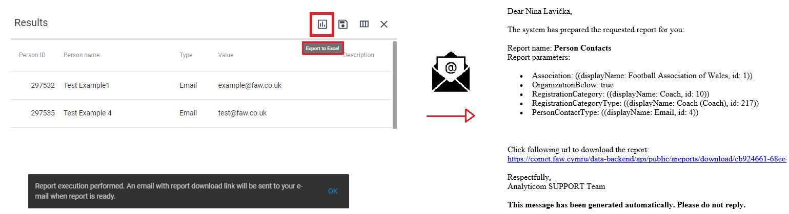 If the report contains less than 1000 rows, the Excel file will be generated automatically and downloaded on the local device. However, a large report that contains more than 1000 rows will be processed asynchronously and delivered to the user’s email address.