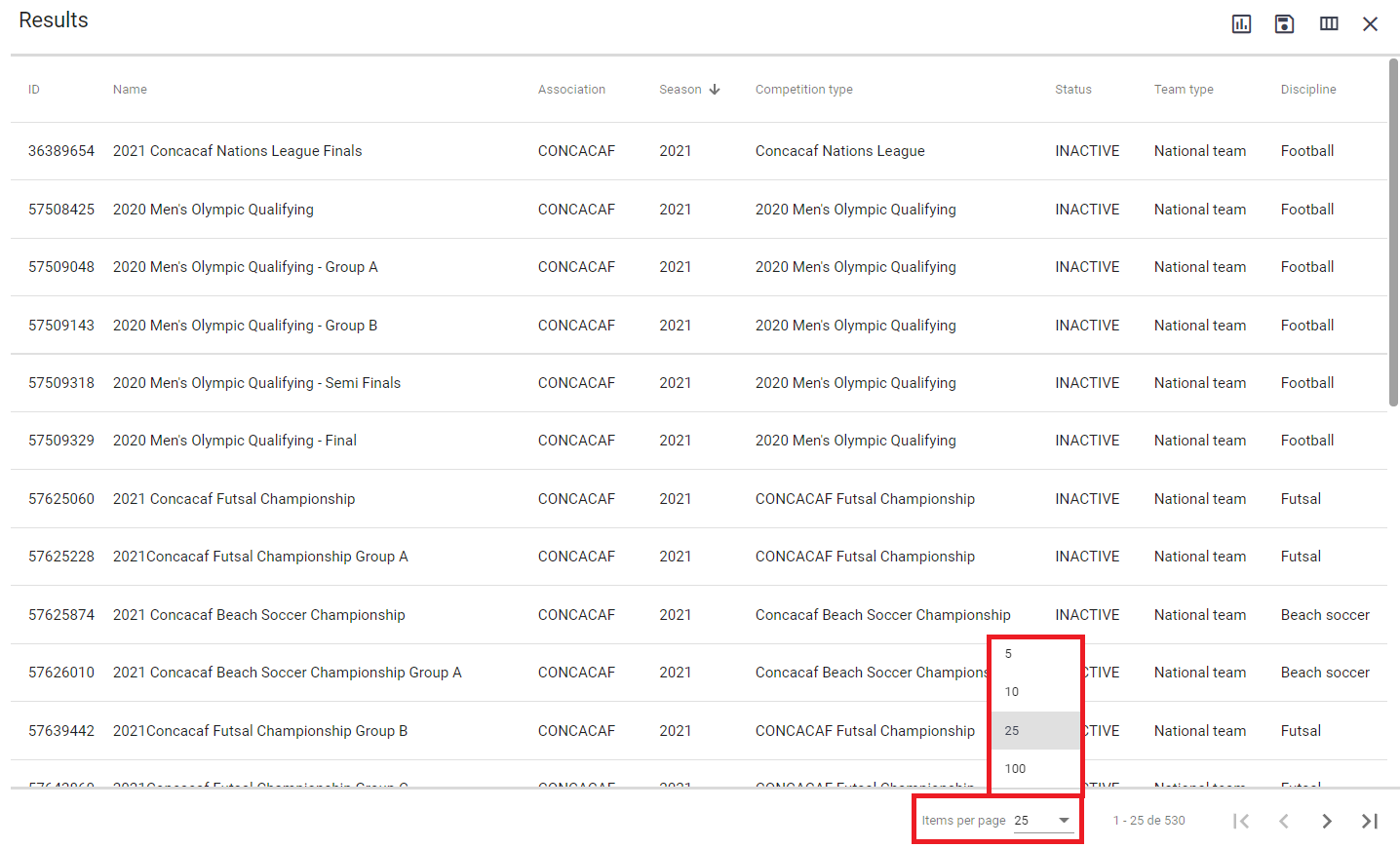 You’ll notice that the number of items per page is by default set to 25. Click on the arrow next to the number 25 and change to any of the other available options.