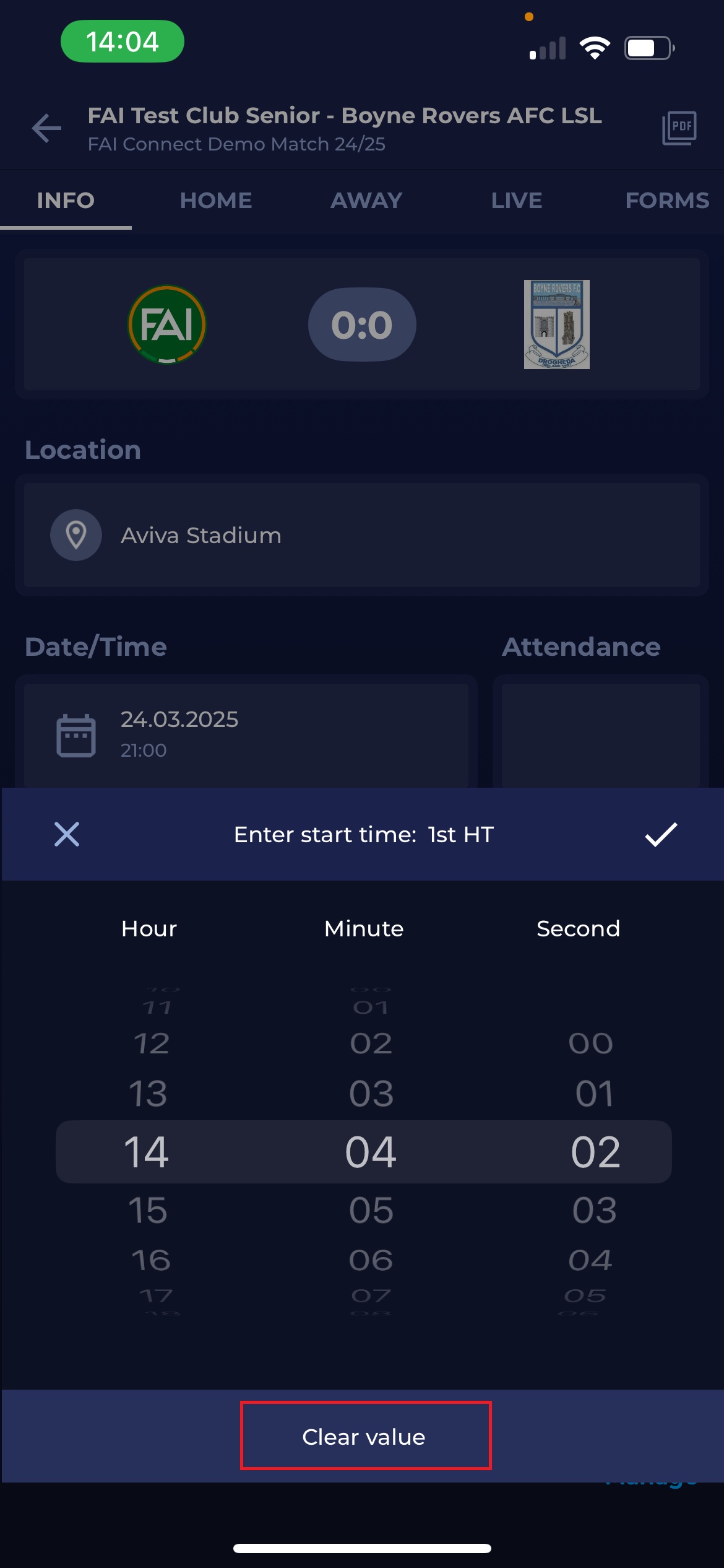 End time of match phases. If accidentally selected the wrong time or started after some time when the referee has actually started the match, you can scroll Hours, Minutes and Seconds, or simply you can remove the entry by clicking ‘Clear value’