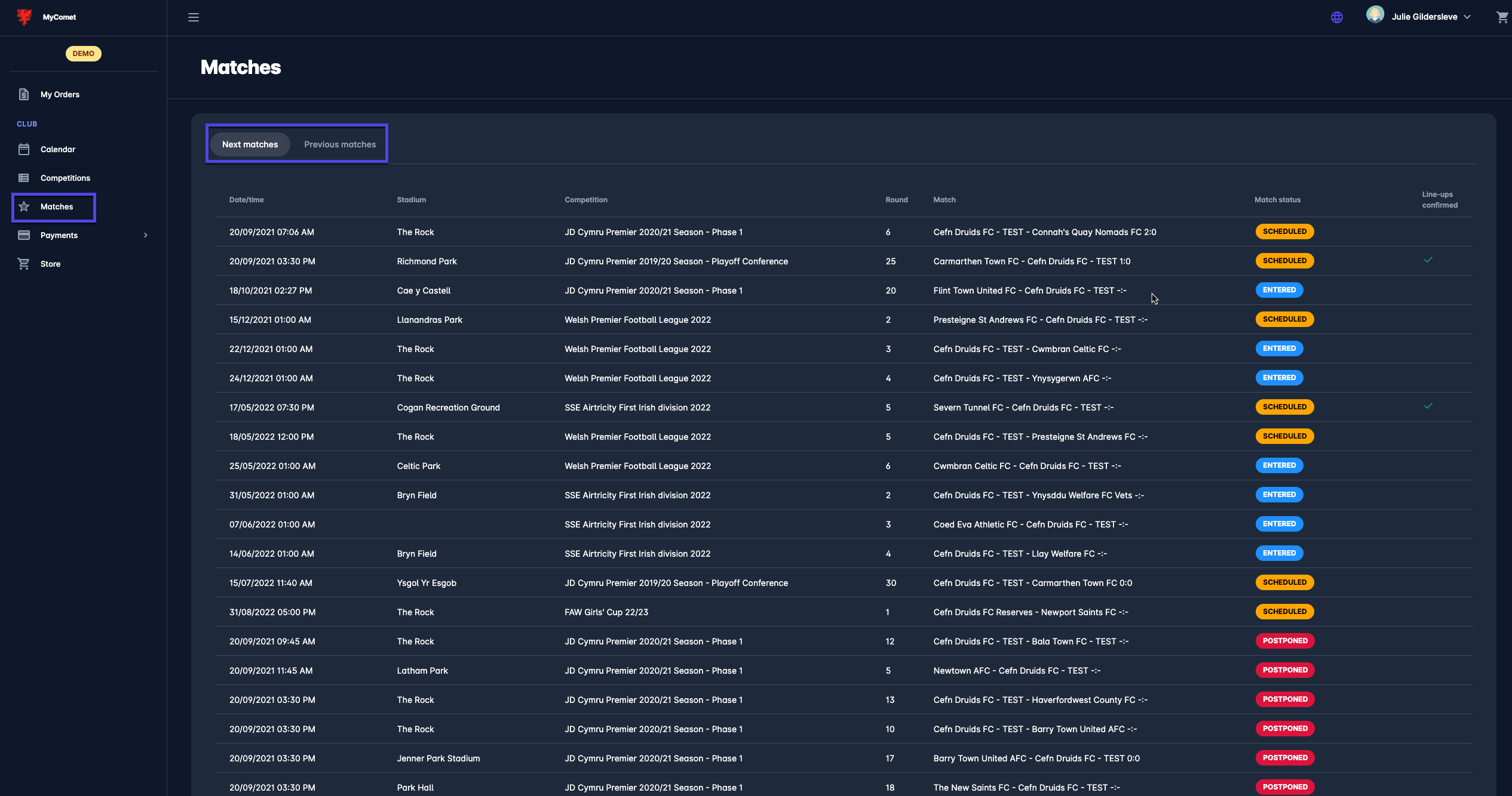 On the Matches menu, Club Admins are able to see the matches of their club divided into two tabs: