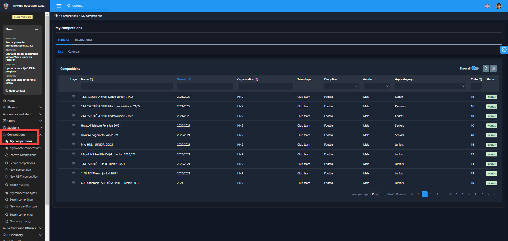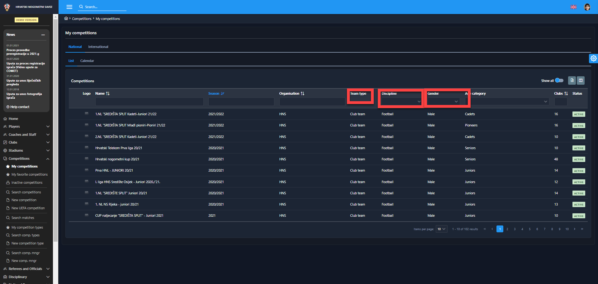 The list of My Competitions is now extended with additional columns: Team type, Discipline, Gender category or Club type (e.g. Football club, Female football club, Futsal club, Female futsal club, Veterans club, etc). The same change is implemented in the My Favorite Competitions menu.