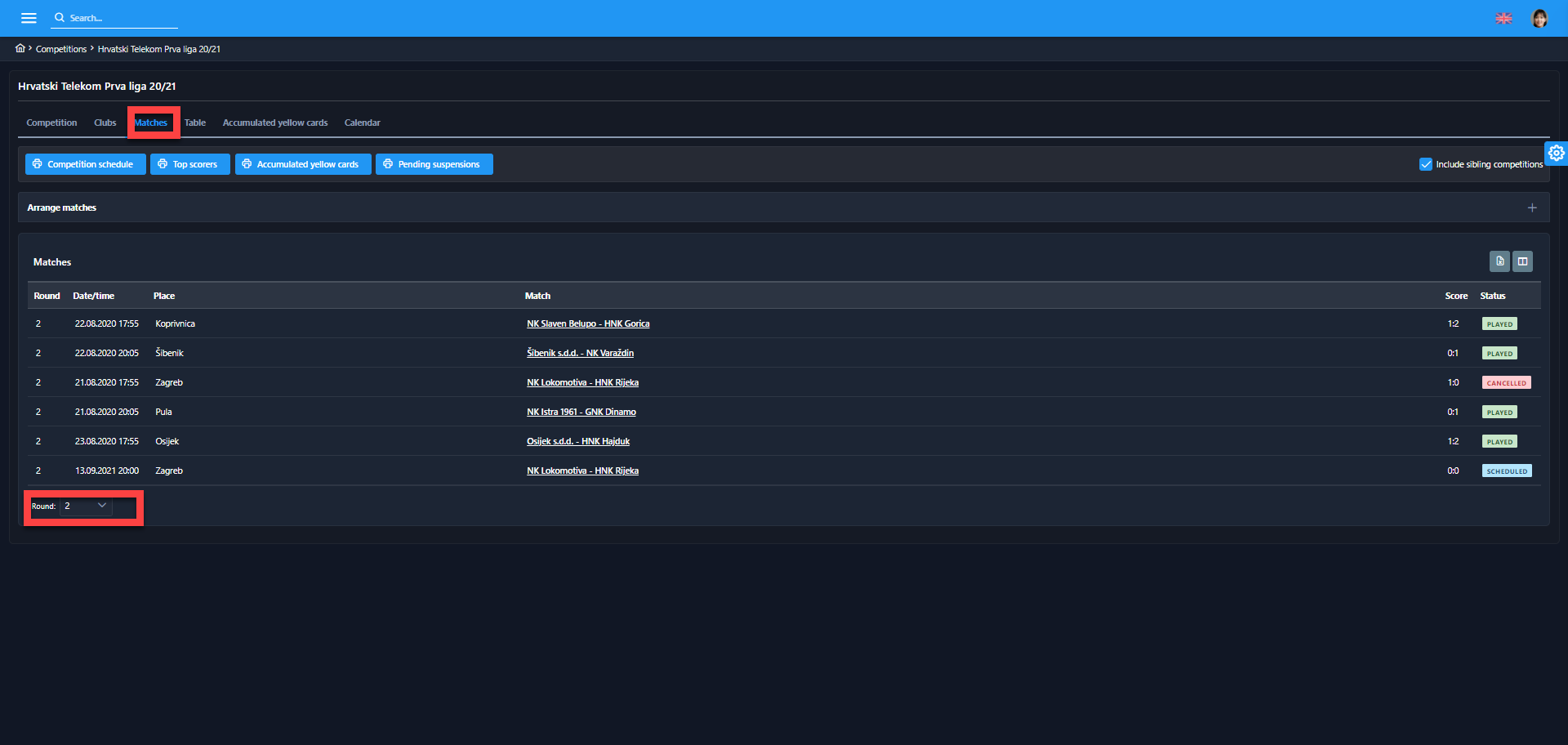 Select a competition to open competition details. If the competition is in progress, the system automatically shows the current round and the list of matches. At the bottom of the list, there is a paging tool that makes the search through the rounds easier.