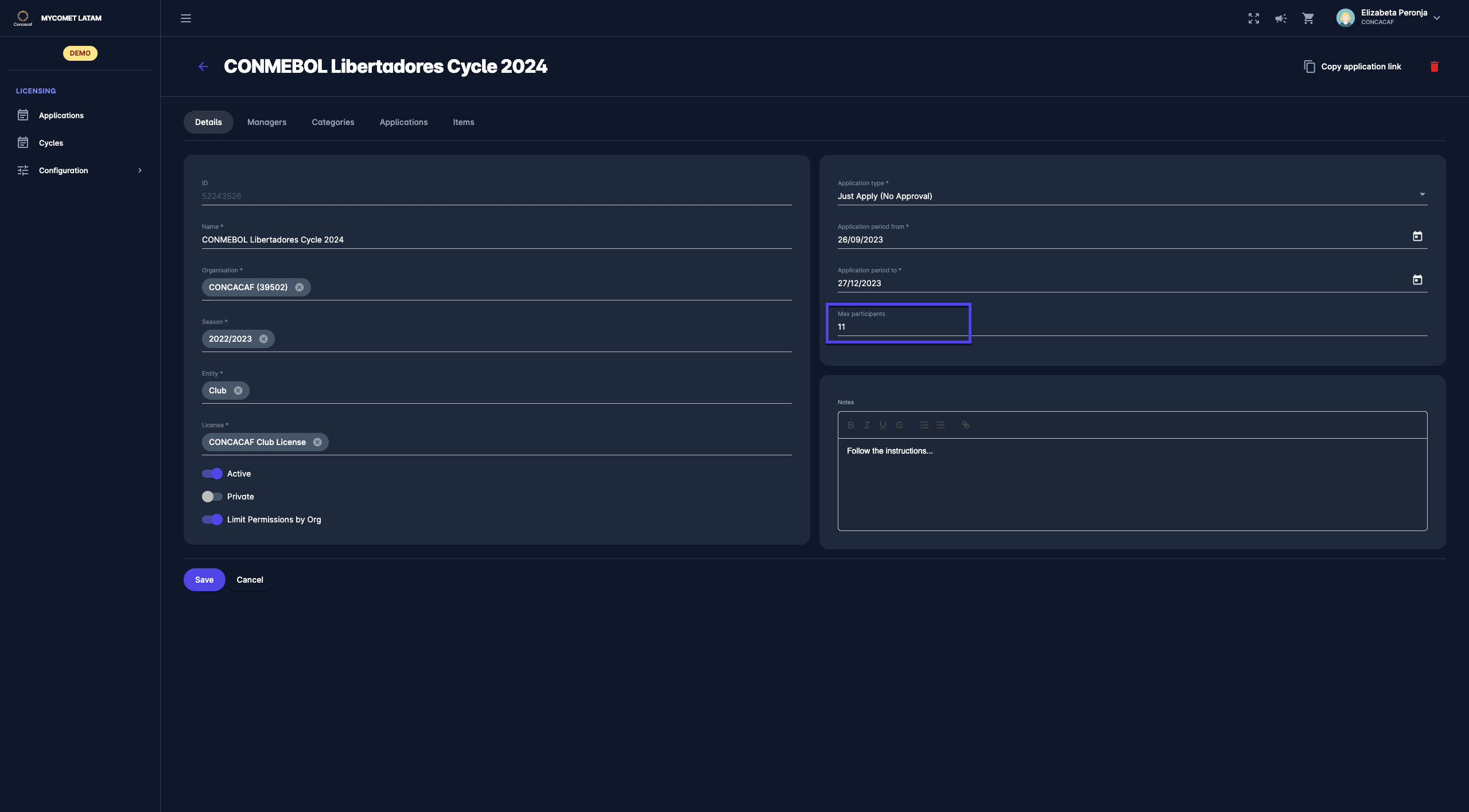 When creating a New Cycle or editing the existing one, Licensing Administrators can control the number of Clubs in the Licence Cycle. The Max Number of Participants is defined on the Details Tab on the Cycle Page.