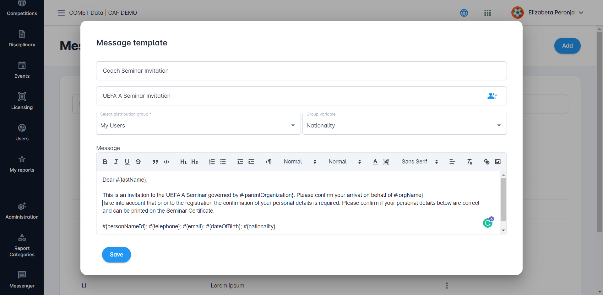 The purpose of Message Templates is to (re)use them in campaigns for all repetitive actions of the organization, such as Holiday announcements, Official notifications, Status of registration updates, Change password requests, and others.