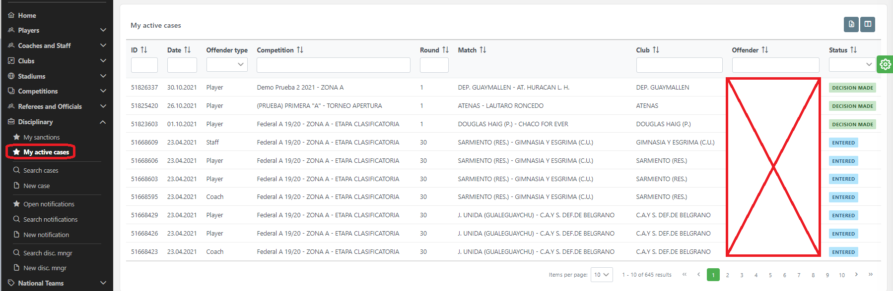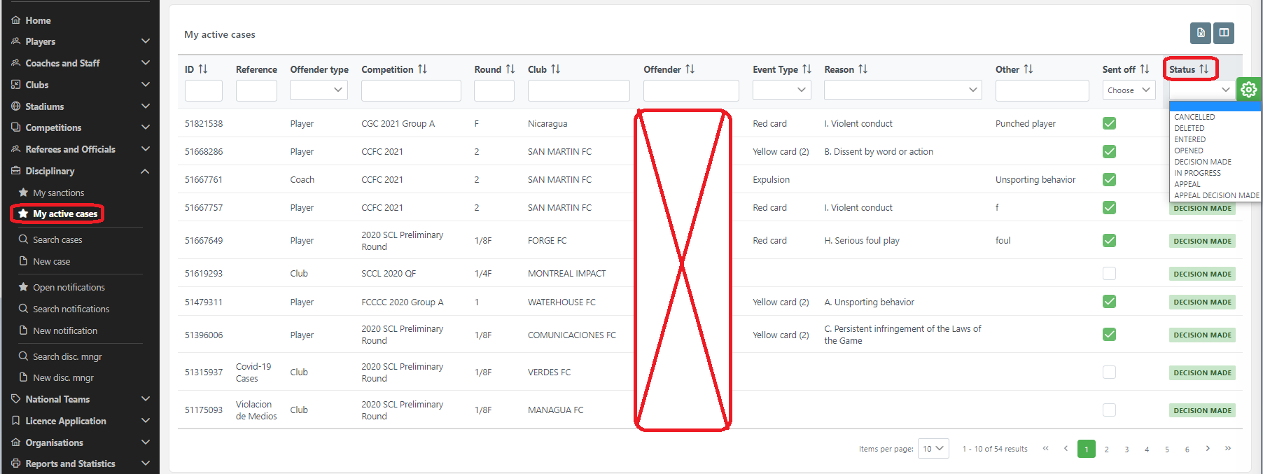 After inserting red card in the Competition Module, the disciplinary case status is set to "DECISION MADE". In order to open it, press the menu item "Search cases". The player is automatically sanctioned and has to serve the automatic one-match suspension. Until that match is played, he will be marked in red in the Competition Module.