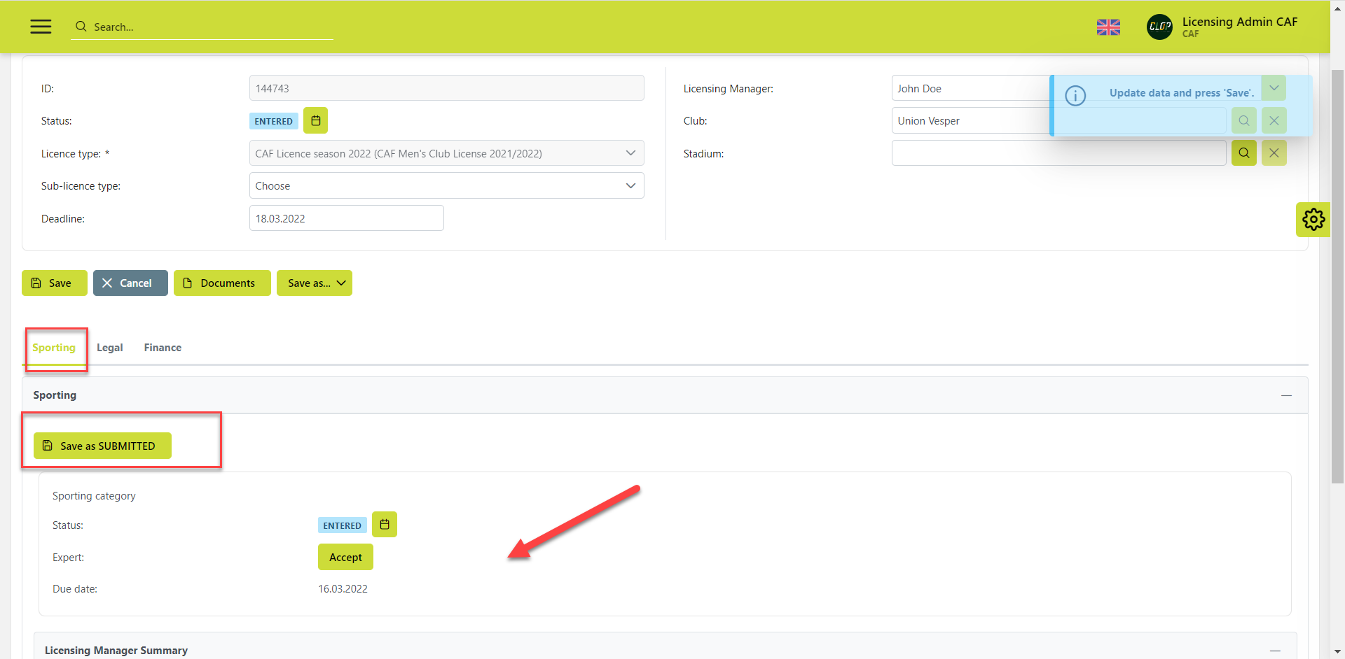 Submit necessary categories by clicking on ✉ the Save as SUBMITTED