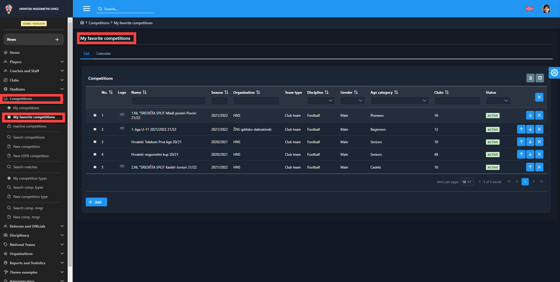 My Favorite Competitions is a menu located under the "Competitions" sub-menu group which provides quick access to your shortlisted (favorite) competitions.