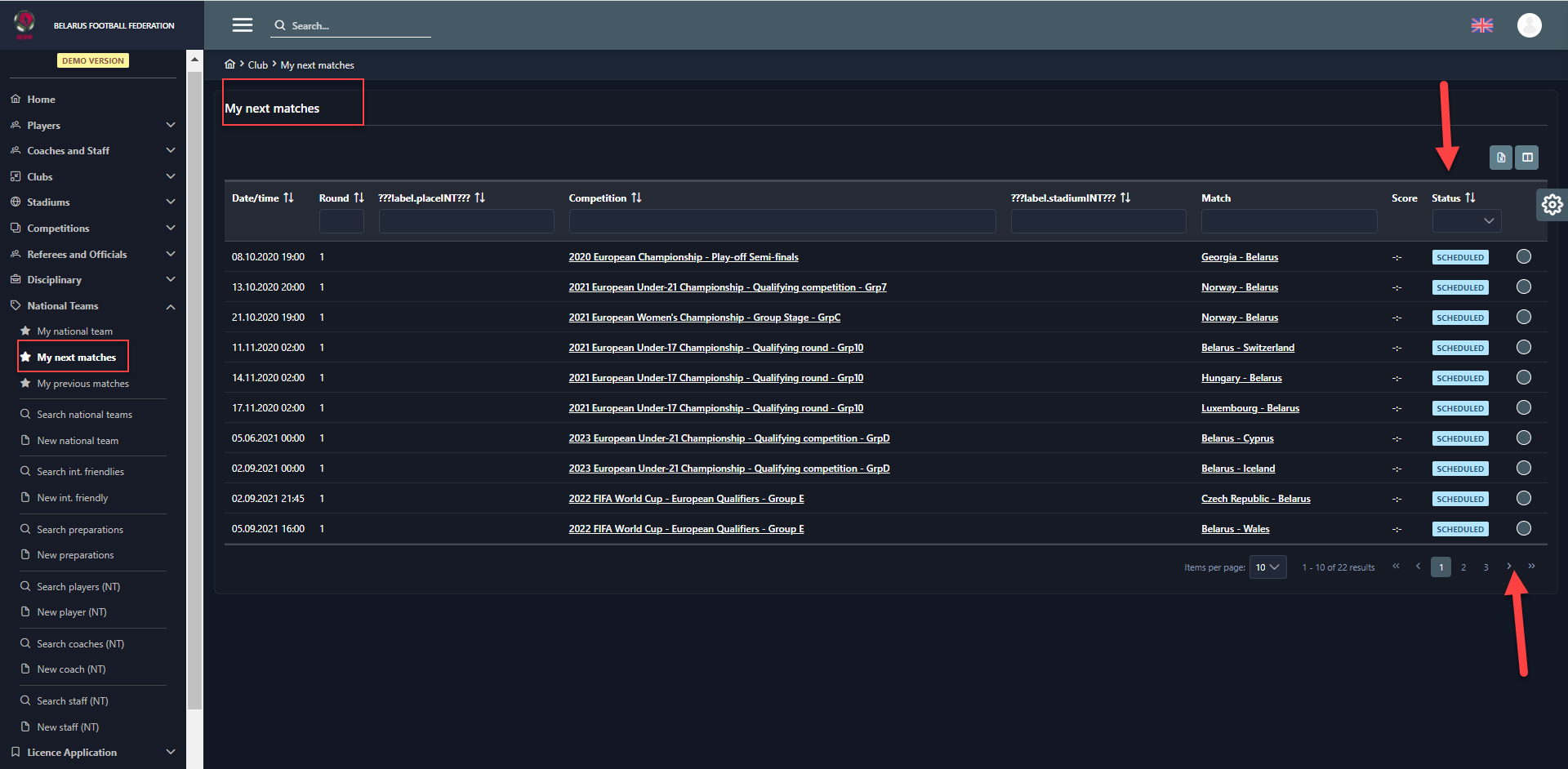 My next and My previous matches menu items allow referees, delegates, observers and other match officials to see the matches to which they were assigned to.