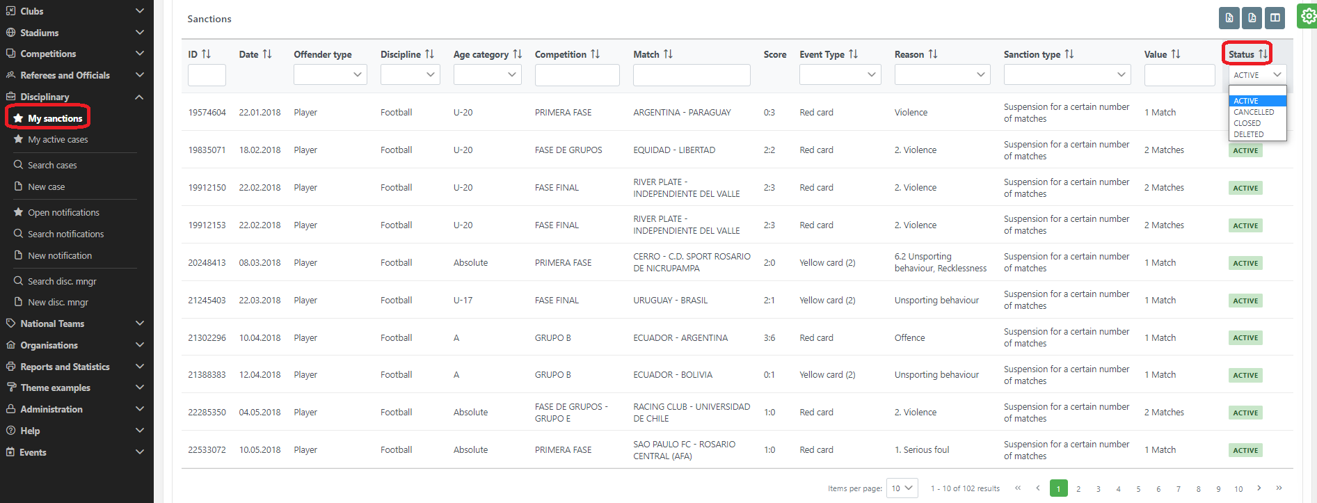 List of “My sanctions” would contain the sanctions contained in disciplinary cases of organizations belonging to user organizations hierarchically and sanctions contained in disciplinary cases of competitions that are managed by the user.