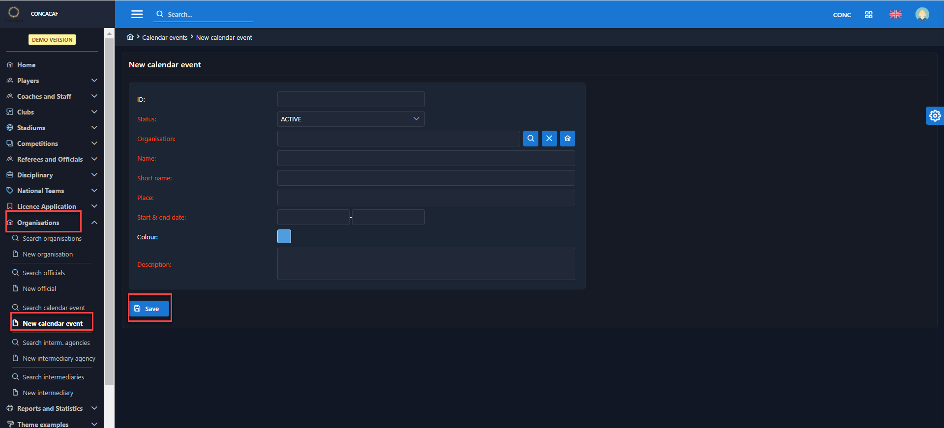 Click the main menu item New calendar event under the organization tab on the left navbar