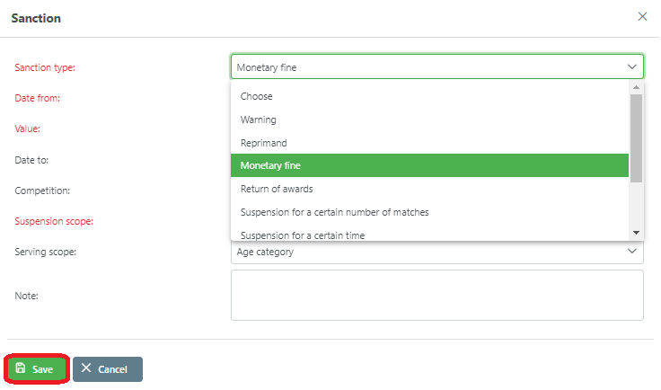 On the same screen is an โ Add sanction tab. Click on it to open a window to select a sanction type. Note that the applicable sanctions vary according to the offender type; the sanctions are not the same for individuals and organizations.