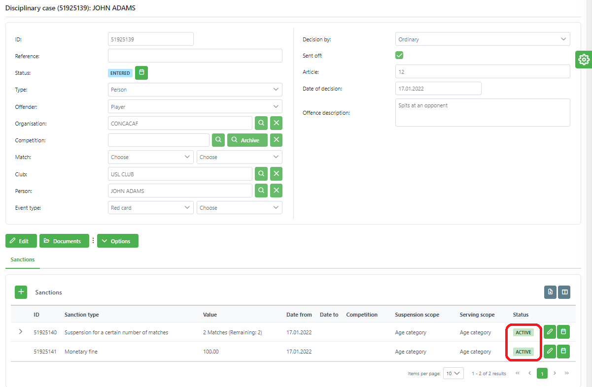 After you click โthe ๐พ Save button, the selected sanctions are stored in the system and become visible on the list of sanctions for a specific disciplinary case (in status ENTERED). A sanctioned status is set to ACTIVE.