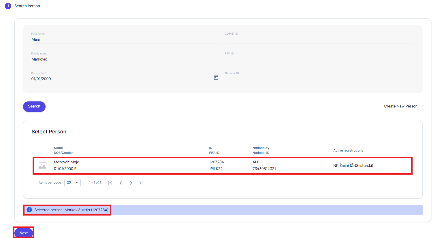 Date of Birth, and at least one of the following details: Family name, National ID, COMET ID, FIFA ID,
