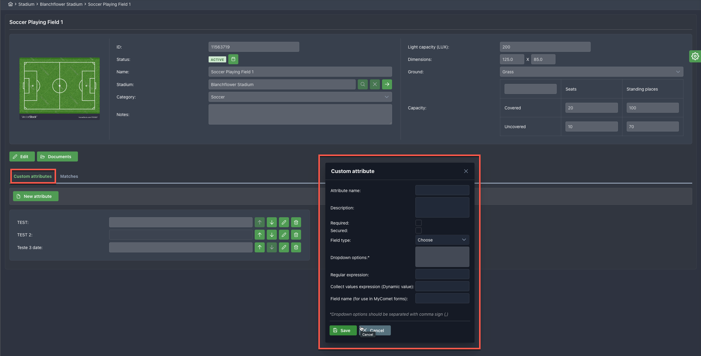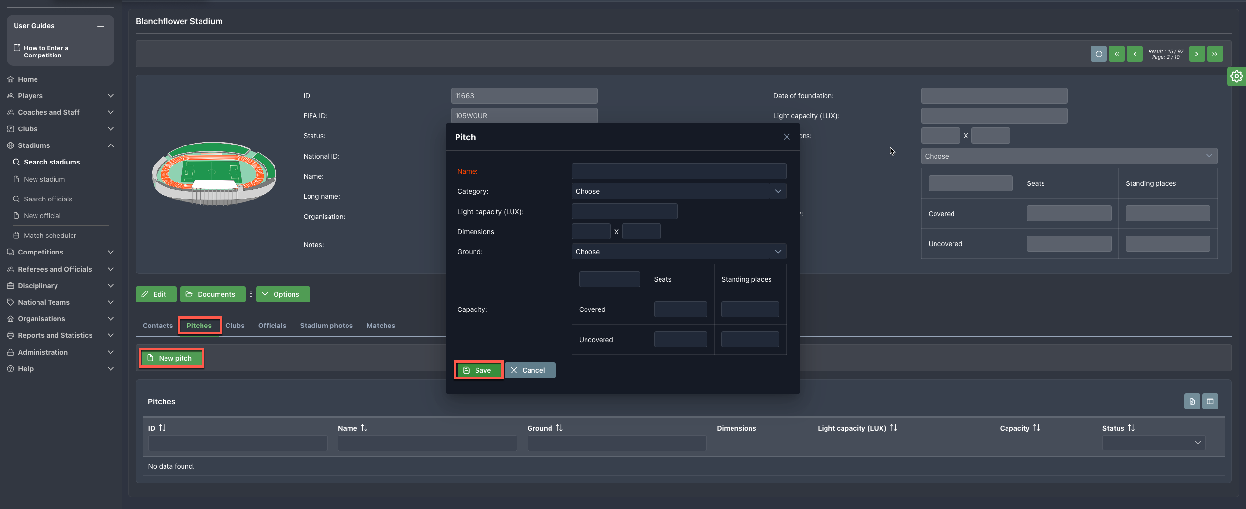 The Stadium Form in the COMET System has been upgraded with the functionality of adding Pitches Entities (stadium parts/ fields) to the stadium. COMET Stadium Administrators are able to add a number of stadium pitches (playing fields/ parts) and manage them as separate entities with specific details and attributes. Accordingly, now matches can be linked to a particular pitch (playing field) of a specific stadium.